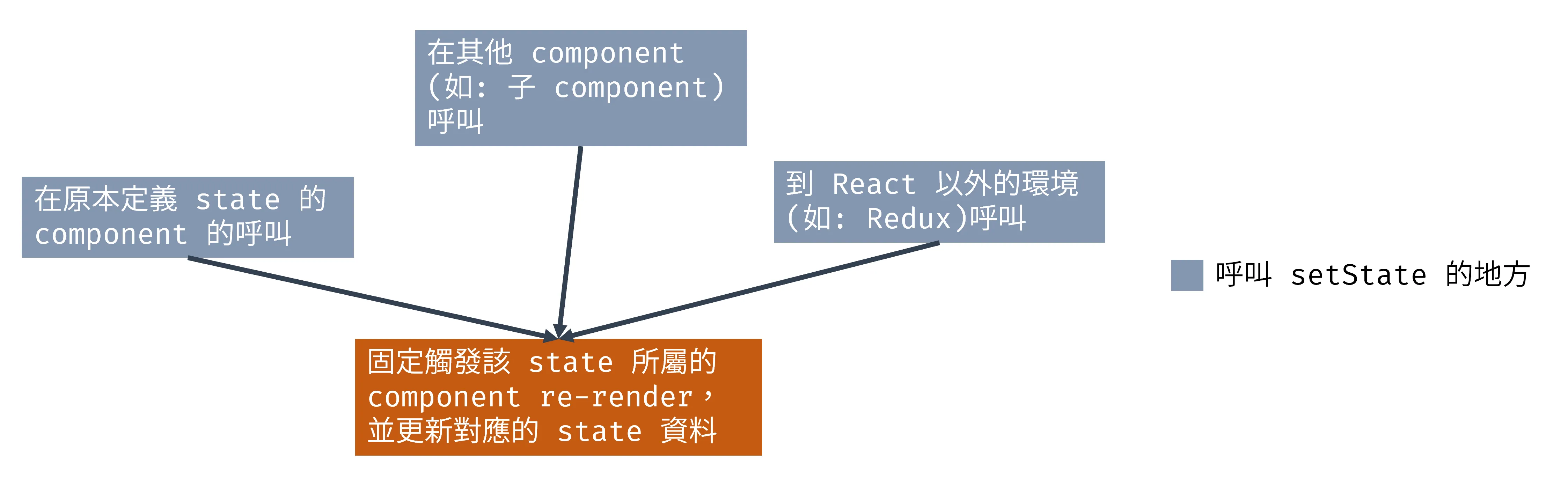 以上機制讓我們能隨意傳遞setState方法並在任何地方都能更新 state 並觸發 component re-render。呼叫setState對 React 來說,只是「接收到不知道從哪來更新資料請求」;對該 state 對應的 component 來說,只是「憑空收到新資料並 re-render」,再往下傳遞 props 給子 component,一切運作仍維持由上往下的單向資料流。