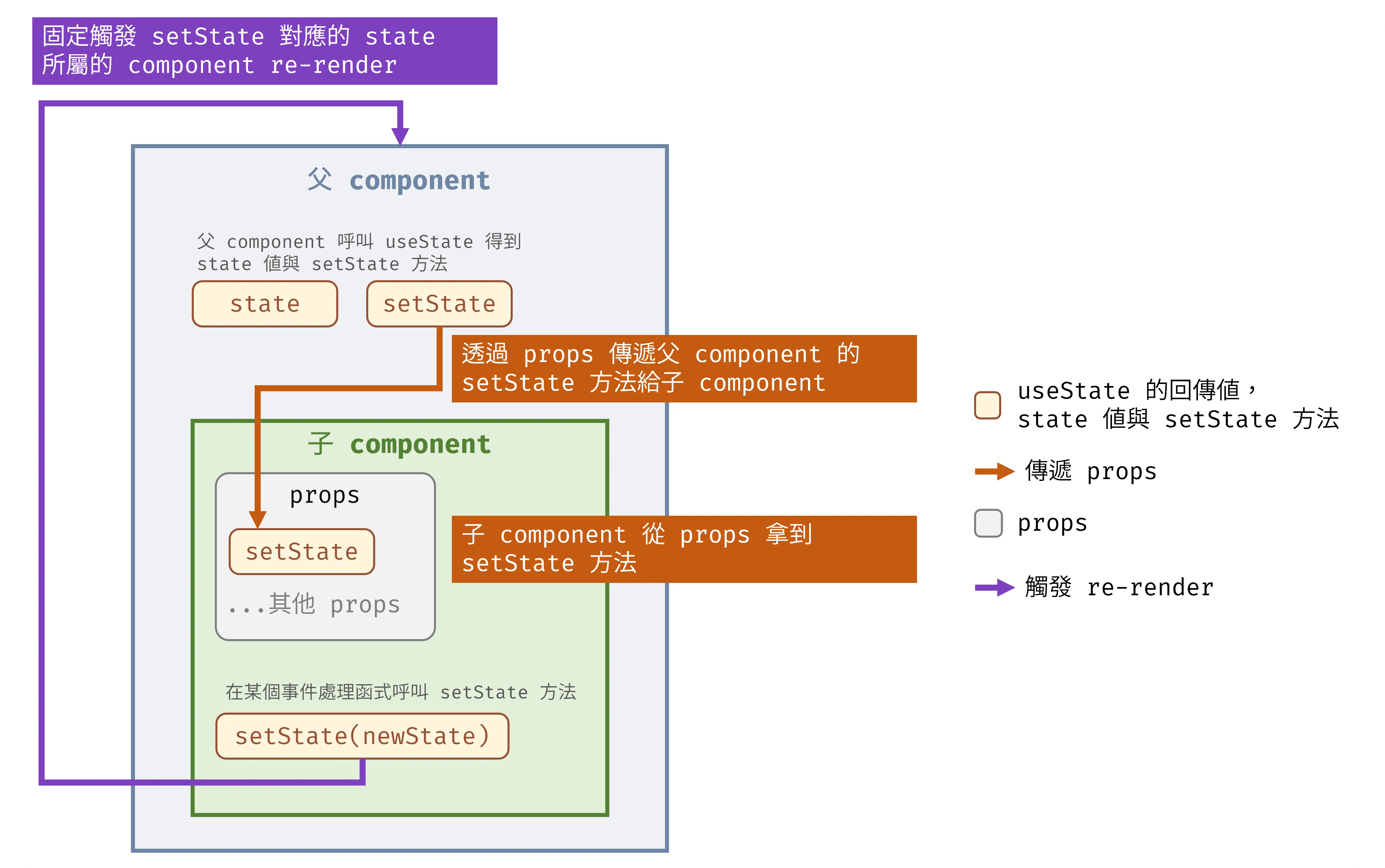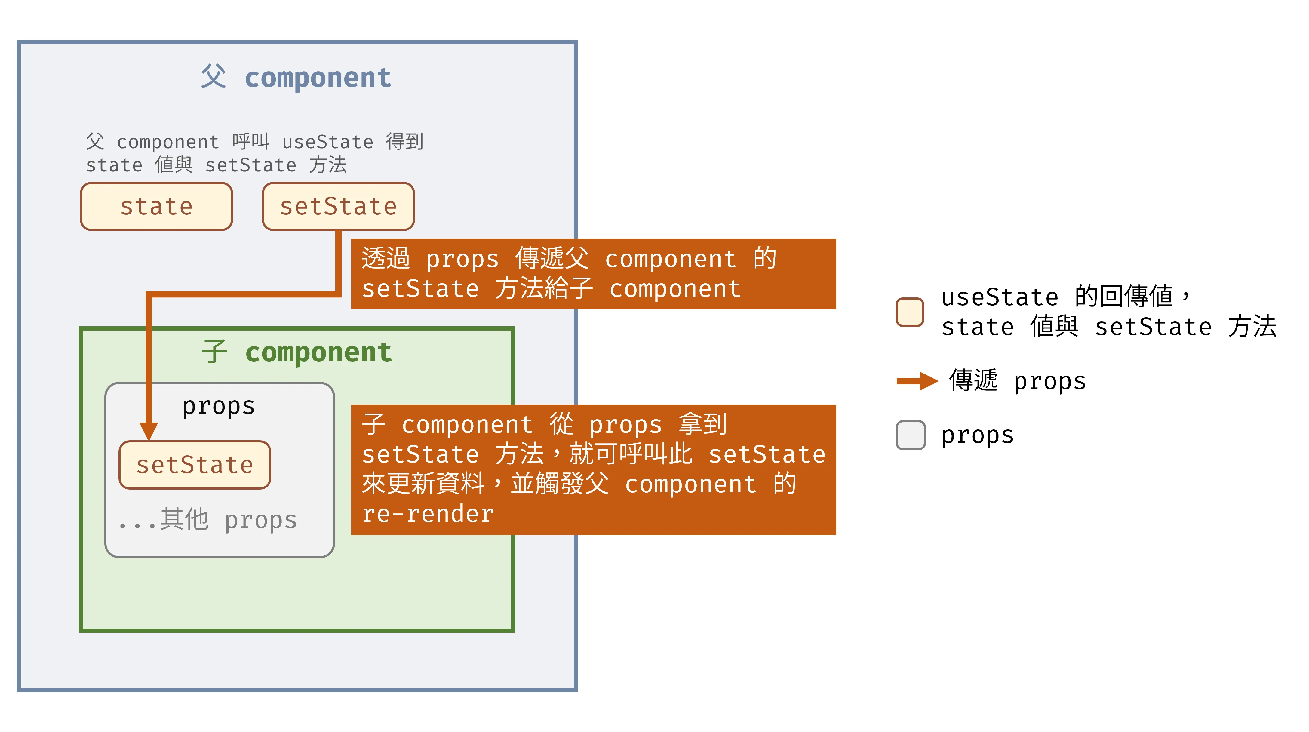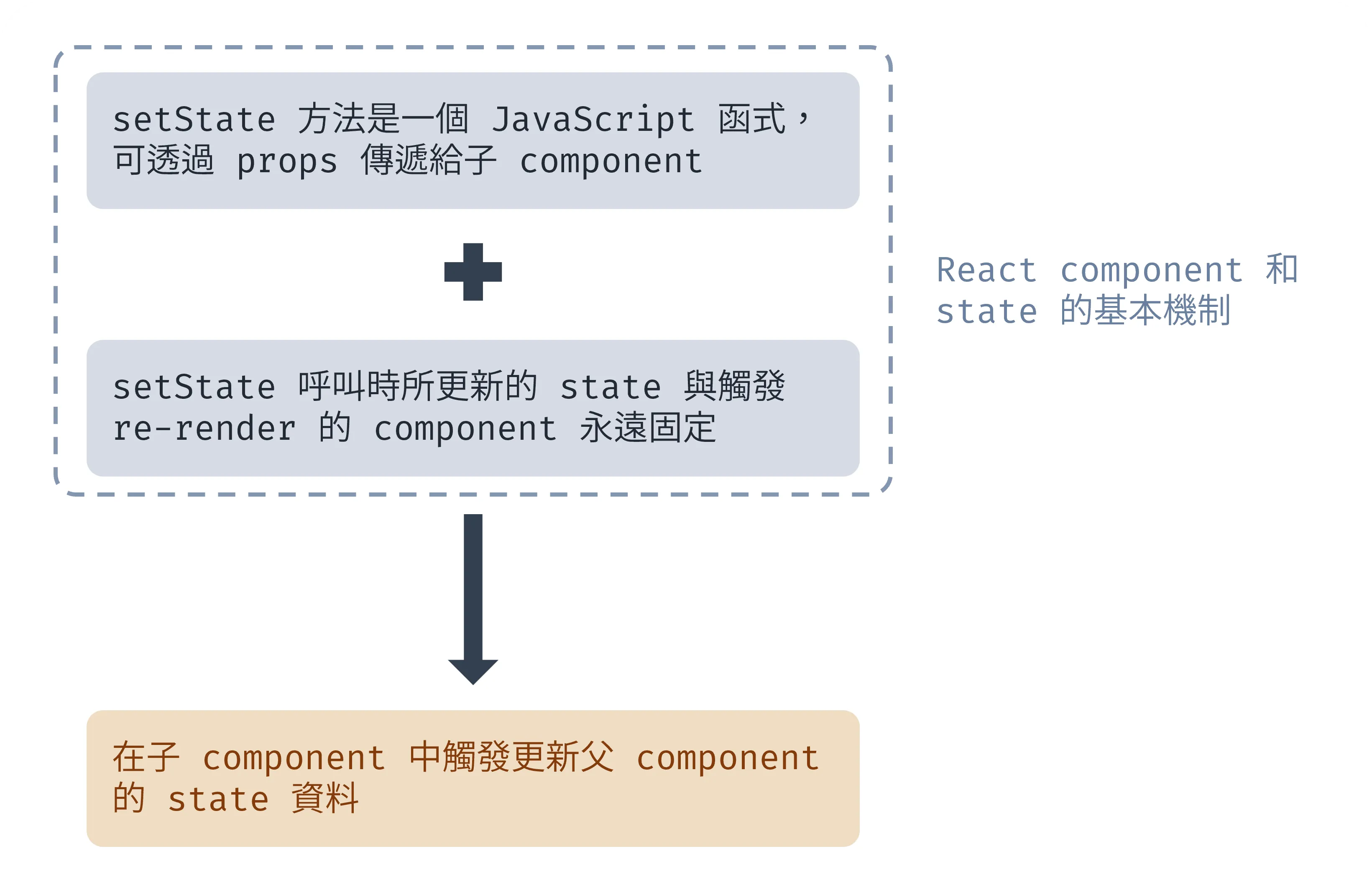 子 component 要如何取得父 component 的 setState 方法?我們可透過 props 來傳遞,因為 props 可傳遞任何資料型別的資料,而 setState 作為一個 JavaScript 函式,當然也可透過 props 來傳遞。示意圖如下。