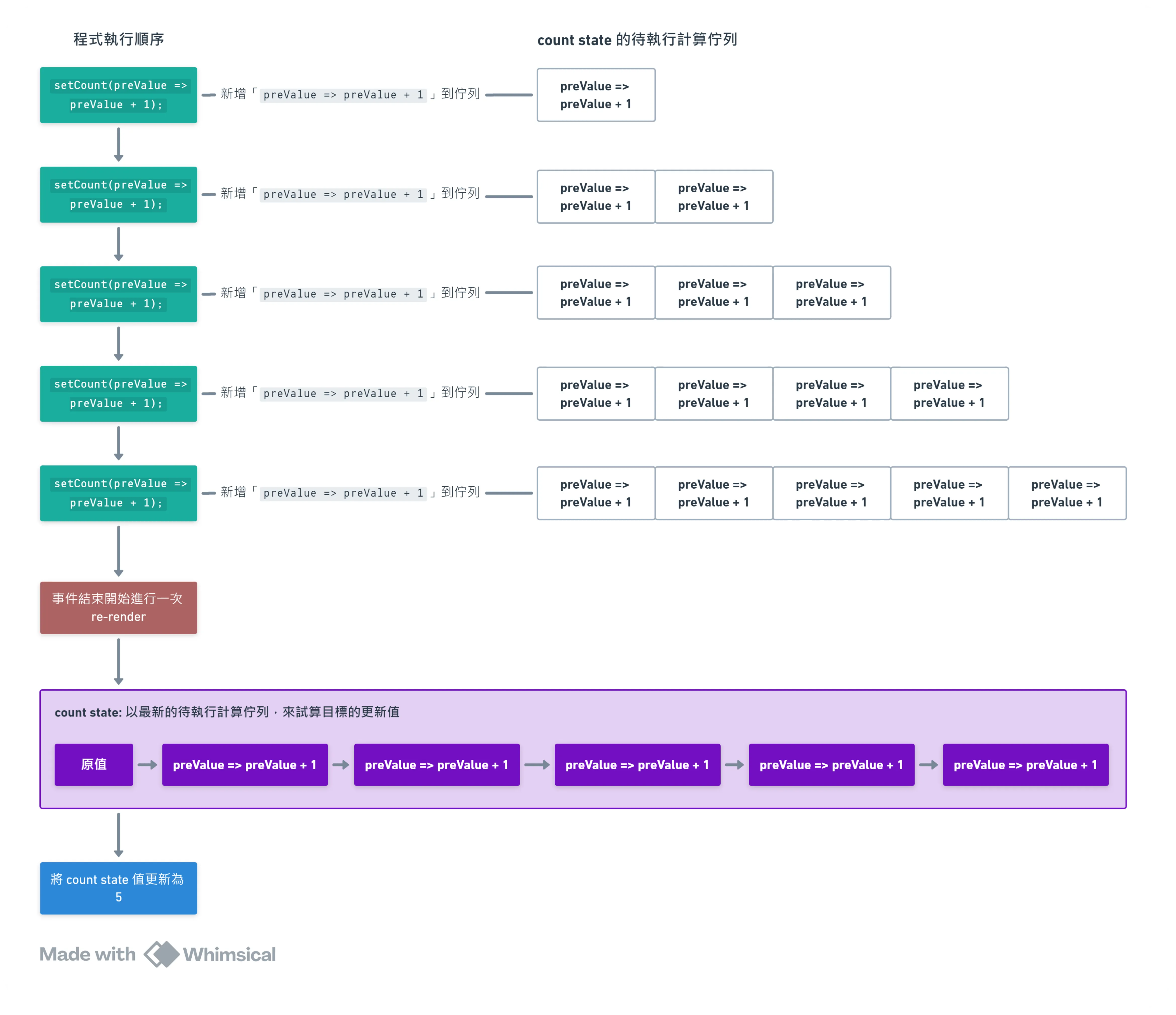 //執行到這裡時,此事件已經沒有其他後續事情要處理 //開始統一執行一次 re-render //依據 count state 的待執行佇列,依序試算並得到結果 //原值 -> 「preValue => preValue + 1」 -> 「preValue => preValue + 1」 -> 「preValue => preValue + 1」 -> 「preValue => preValue + 1」 -> 「preValue => preValue + 1」 }