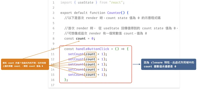 handleButtonClick函式作用域中的 count 變數值永遠都是0」這種行為感到困惑的話,可能是對 JavaScript 的核心特性「closure(閉包函式)」還不夠熟悉,建議先徹底理解閉包的概念再繼續學習 React。因為 React 的概念與運作大量應用了此 JavaScript 特性。