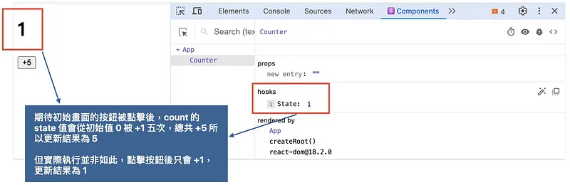 return ( <> <h1>{count}</h1> <button onClick={handleButtonClick}>+5</button> </> );}但實際執行時,點擊按鈕後 count 只會 +1,更新畫面後結果顯示為 1: