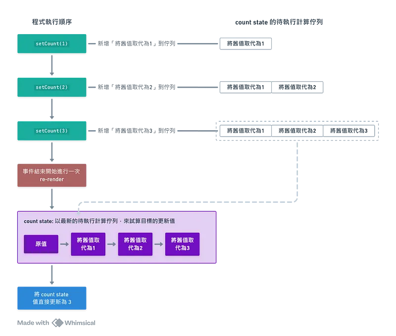 延續上方範例,多次呼叫 setState 時,會先將更新值的動作加到待執行佇列中,最後 count 的 state 值會從 0 只經過一次 re-render 直接更新為 3: