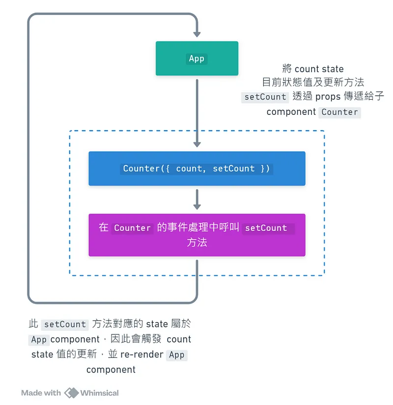 export default function App() { //count state 定義在父 component App,透過 props 傳遞 count state 值和 setCount 方法給 Counter const [count, setCount] = useState(0); const isCountOdd = count % 2 === 1; return ( <div> <p>Counter 值是 {isCountOdd ? "奇數" : "偶數"}</p> <Counter count={count} setCount={setCount} /> </div> );}export default function Counter({ count, setCount }) { //在子 component Counter 的事件處理函式中呼叫由 props 傳遞的 setCount 方法 const decrement = () => setCount(count - 1); const increment = () => setCount(count + 1); return ( <div> <button onClick={decrement}>-</button> <span>{count}</span> <button onClick={increment}>+</button> </div> );}流程如下: