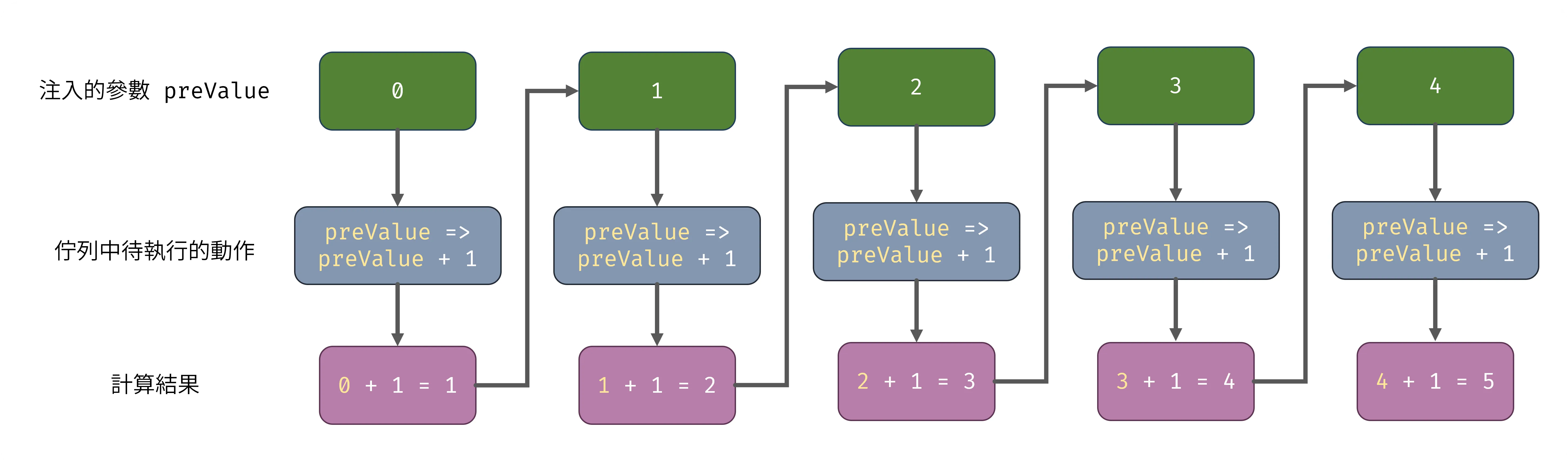 第一個 updater function 計算時,會將目前 render 的 state 值作為參數 preValue 傳入,此 updater function 回傳值又會做為佇列中下一個 updater function 的參數,示意圖如下。