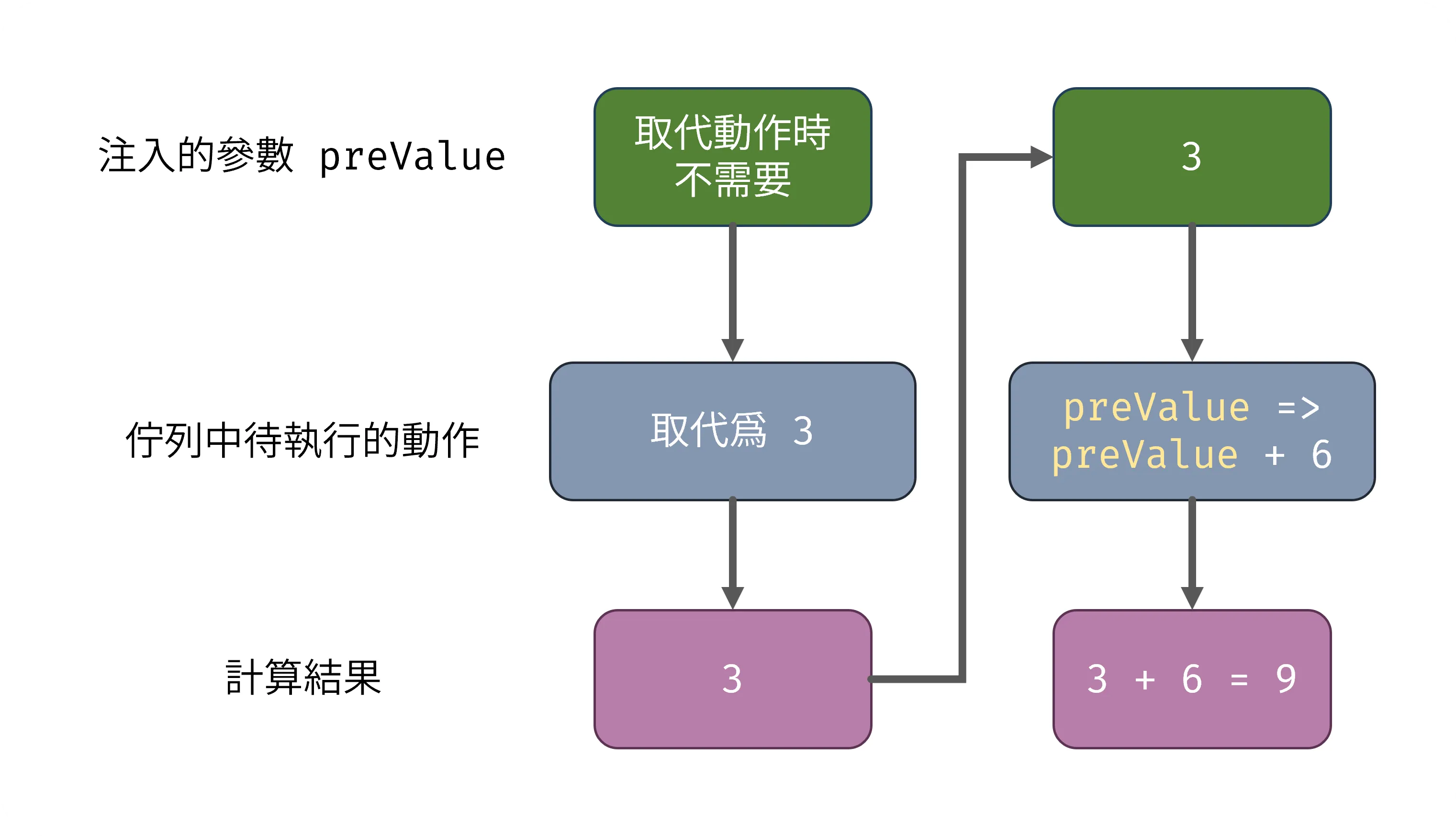 //...}在計算 count state 的值時,「取代為某個值」的計算結果也會作為 updater function 的參數,示意如下: