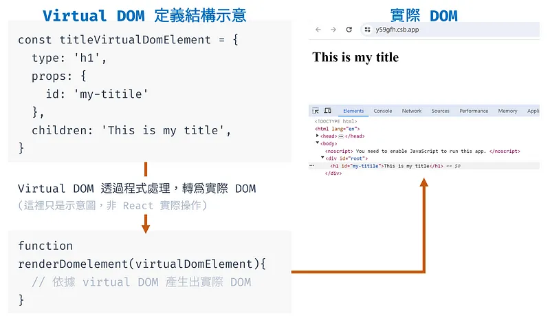 { type: 'h1', props: { id: 'my-titile', children: 'This is my title'}, key: null, ref: null, $$typeof: Symbol('react.element')}將這個 React element 交由 React 轉換處理後,就可自動產生實際 DOM 畫面。