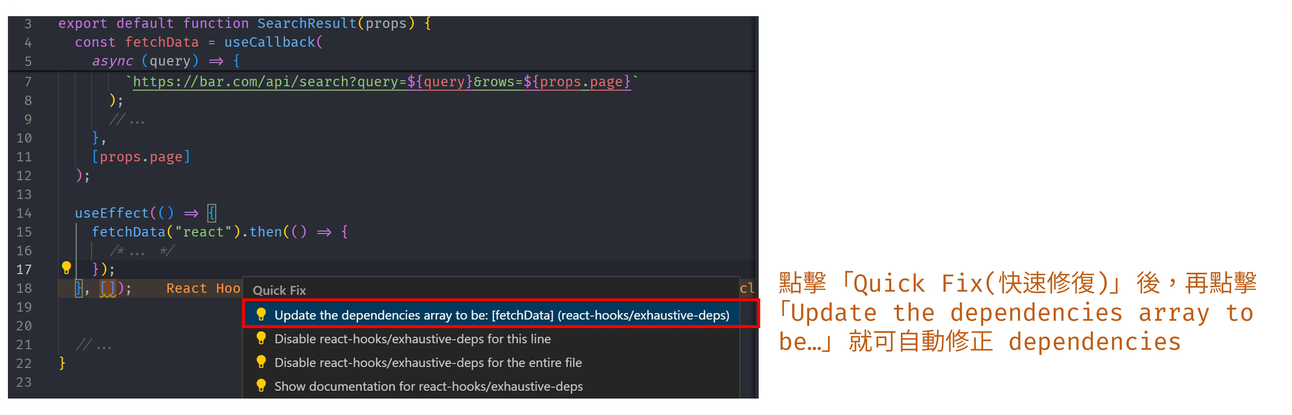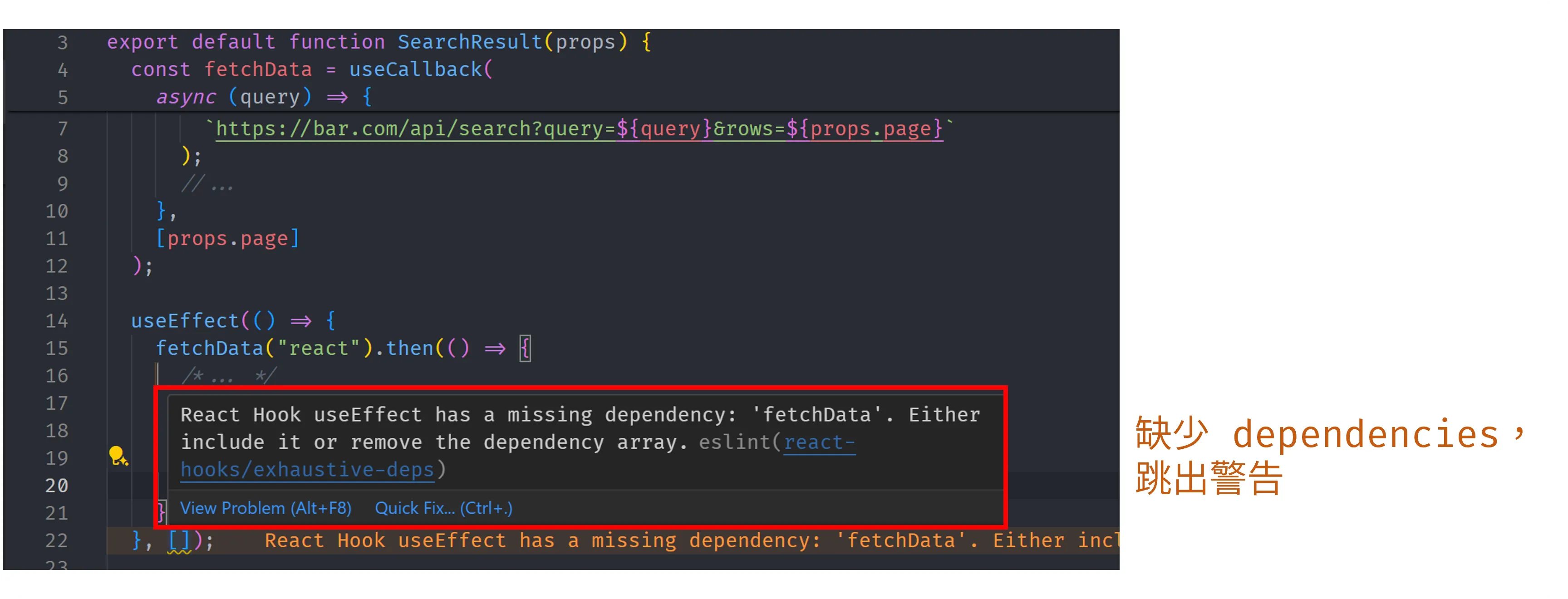 export default function SearchResult(props) { const fetchData = useCallback( async (query) => { const result = await fetch( `https://bar.com/api/search?query=${query}&page=${props.page}` ); //... }, [props.page] //dependencies 誠實,此函式依賴 props.page 資料;當 props.page 值與前一次 render 版本相同,就回傳前一次 render 產生的 fetchData 函式;當 props.page 值與前一次 render 版本不同,則回傳此次 render 產生的 fetchData 函式 );