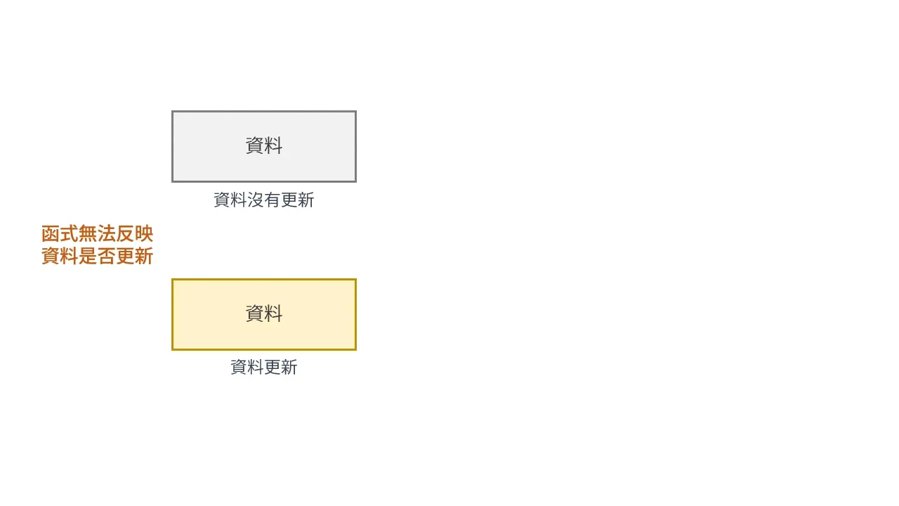 然而,當函式被定義在 component function 內,函式每次 render 都會被重新產生,就無法反映資料是否真的有更新,副作用因而無法判斷源頭資料是否有更新,而一律判定為有發生改變: