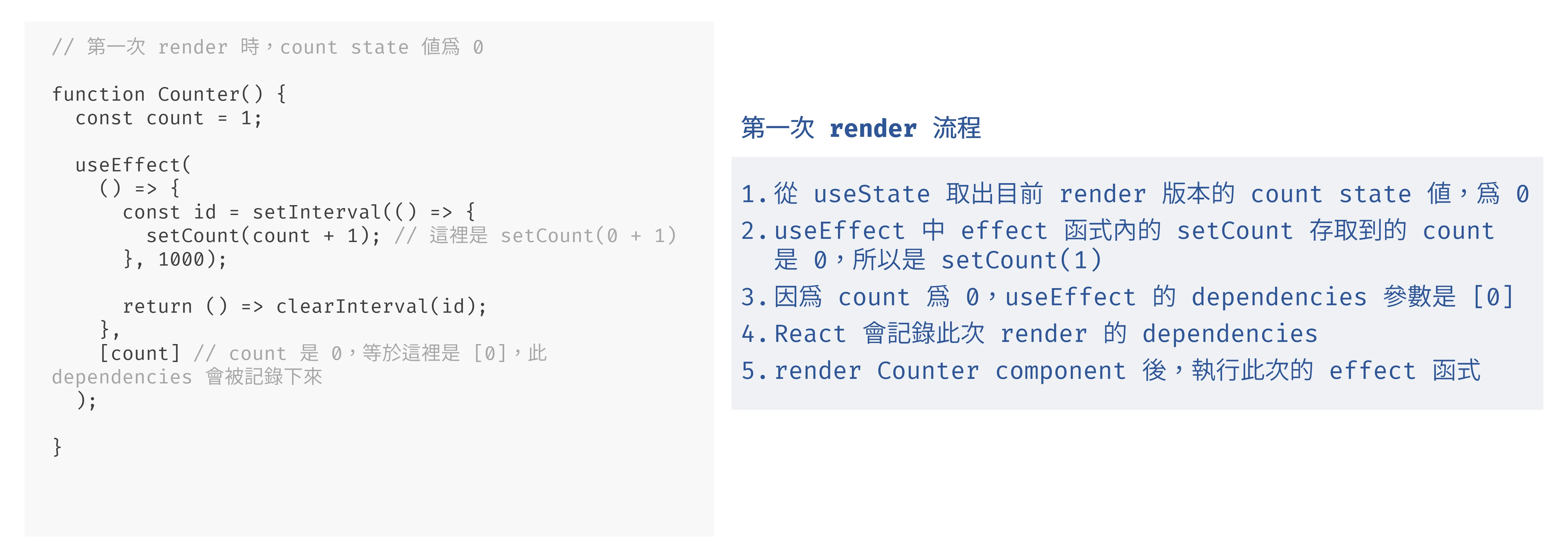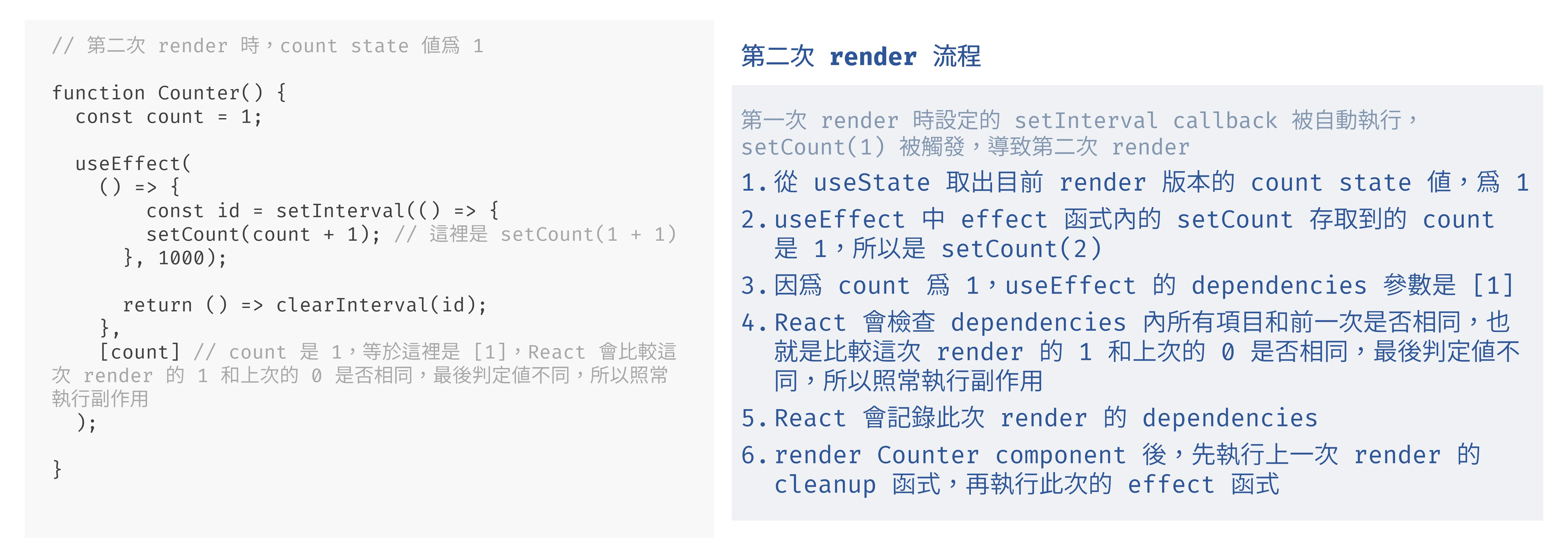 return () => clearInterval(id); }, [count] //effect 函式依賴 count 資料,dependencies 要誠實填寫 effect 函式依賴的資料 );誠實填寫 dependencies 的 render 流程如下: