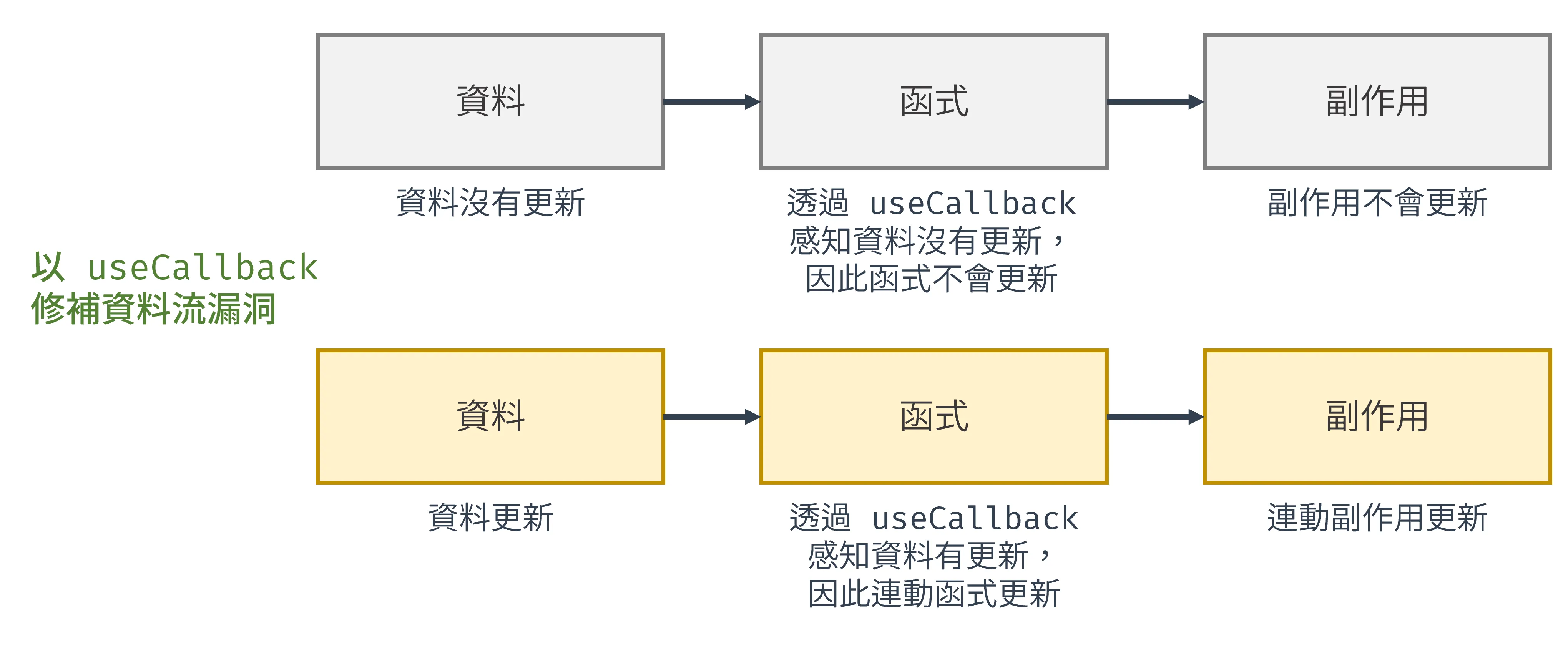 透過 useCallback ,可修補「資料→函式→副作用」資料流的漏洞,函式可正確感知資料變化,副作用也能正確感知源頭資料是否有變,並正確判斷是否能跳過此次副作用處理。