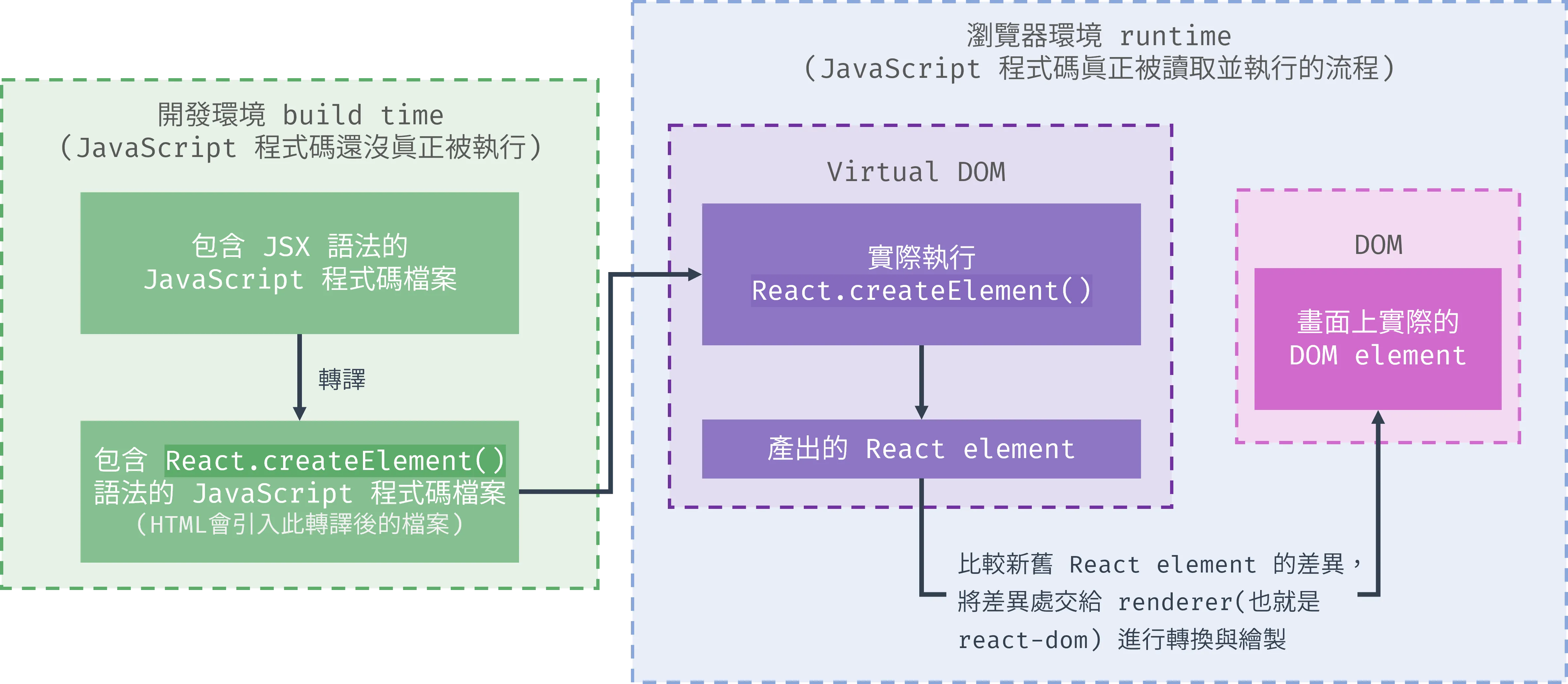 截至目前章節,我們瞭解了 DOM、Virtual DOM、React element 與 JSX 的概念,可用以下這張圖來總結這些概念的綜合關係。