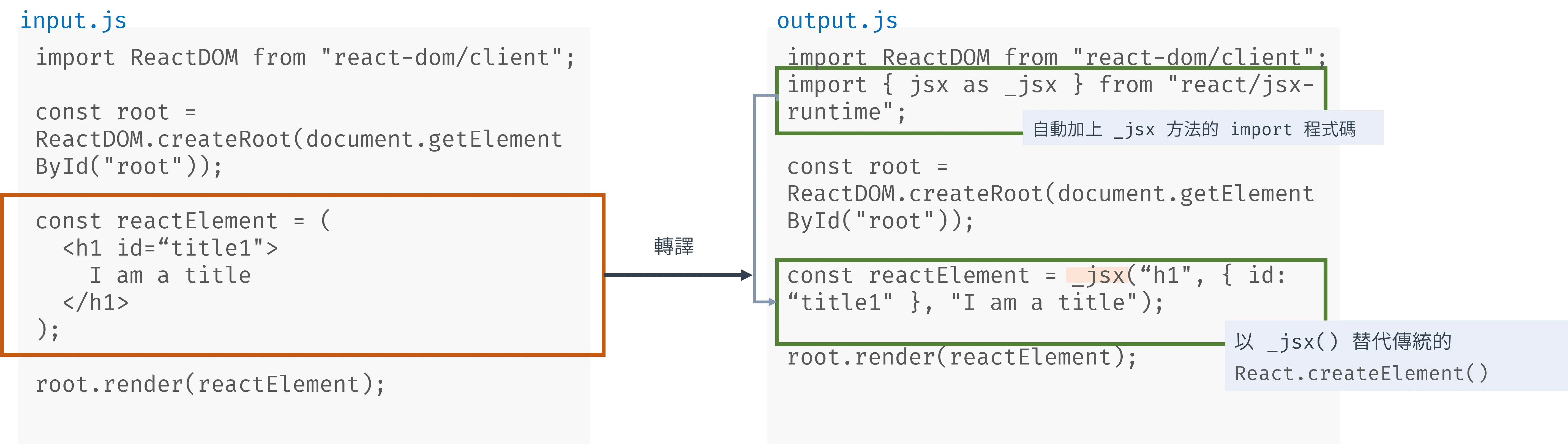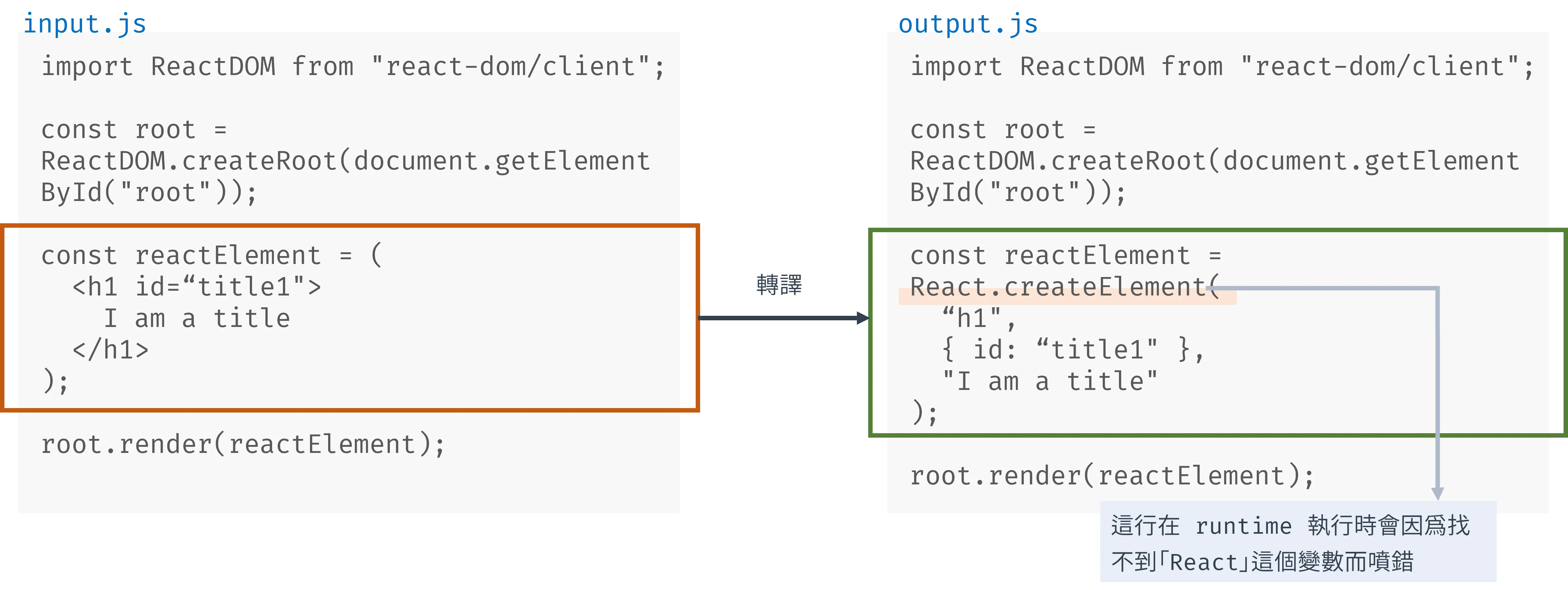 將包含 JSX 語法的檔案交給 JSX transformer 的 Babel 轉譯後,就能產出另一支 JSX 被替換成 React.createElement 的 .js 檔案,而我們在 React 專案的 HTML 所引入的 JS 檔案則是 Babel 轉譯輸出後的檔案,以確保瀏覽器要執行的程式碼不包含 JSX 語法。
