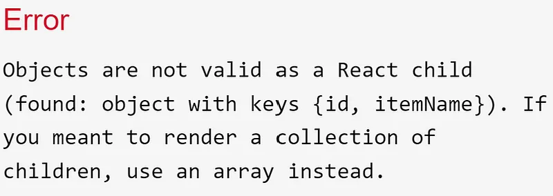 <div>{[1,2,3]}</div> 轉換成實際 DOM element 的結果而如果是 <div>{[ { id: 1, itemName: "apple" }, { id: 2, itemName: "orange" }, { id: 3, itemName: "banana" } ]}</div> 則會轉換失敗,因為子元素是物件,沒辦法轉換到實際 DOM element,會出現錯誤: