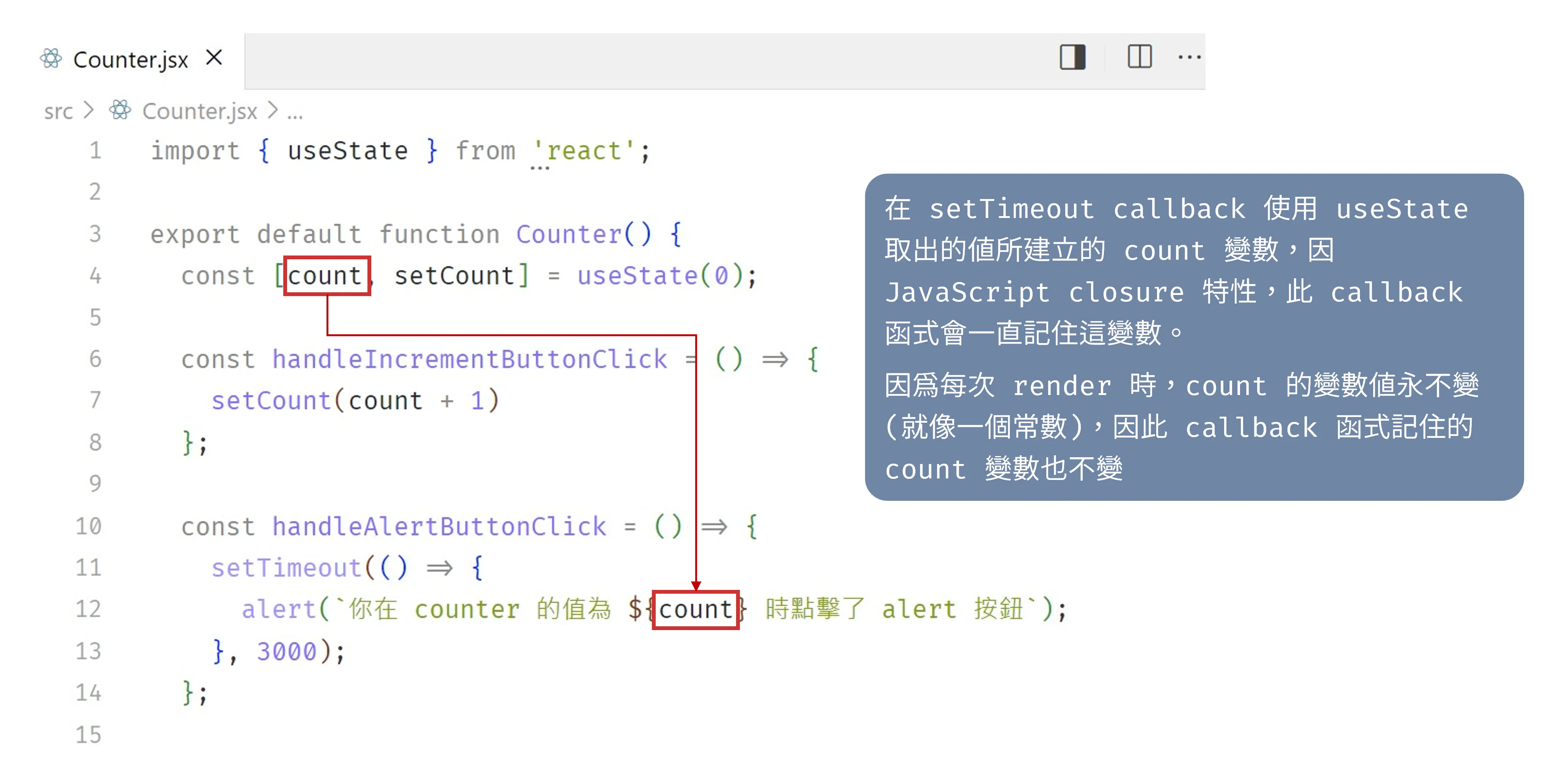 const handleAlertButtonClick = () => { setTimeout(() => { alert(`你在 counter 的值為 ${count} 時點擊了 alert 按鈕`); }, 3000); };