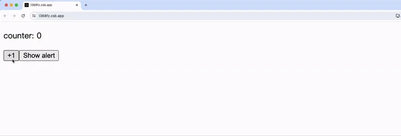 return ( <div> <p>counter: {count}</p> <button onClick={handleIncrementButtonClick}> +1 </button> <button onClick={handleAlertButtonClick}> Show alert </button> </div> );}試著操作以上這段程式碼,若將 counter 數字加到 2 後再點擊 alert,並在三秒內盡快將 counter 數字加到 4,跳出的 alert 訊息仍是「你在 counter 的值為 2 時點擊了 alert 按鈕」:
