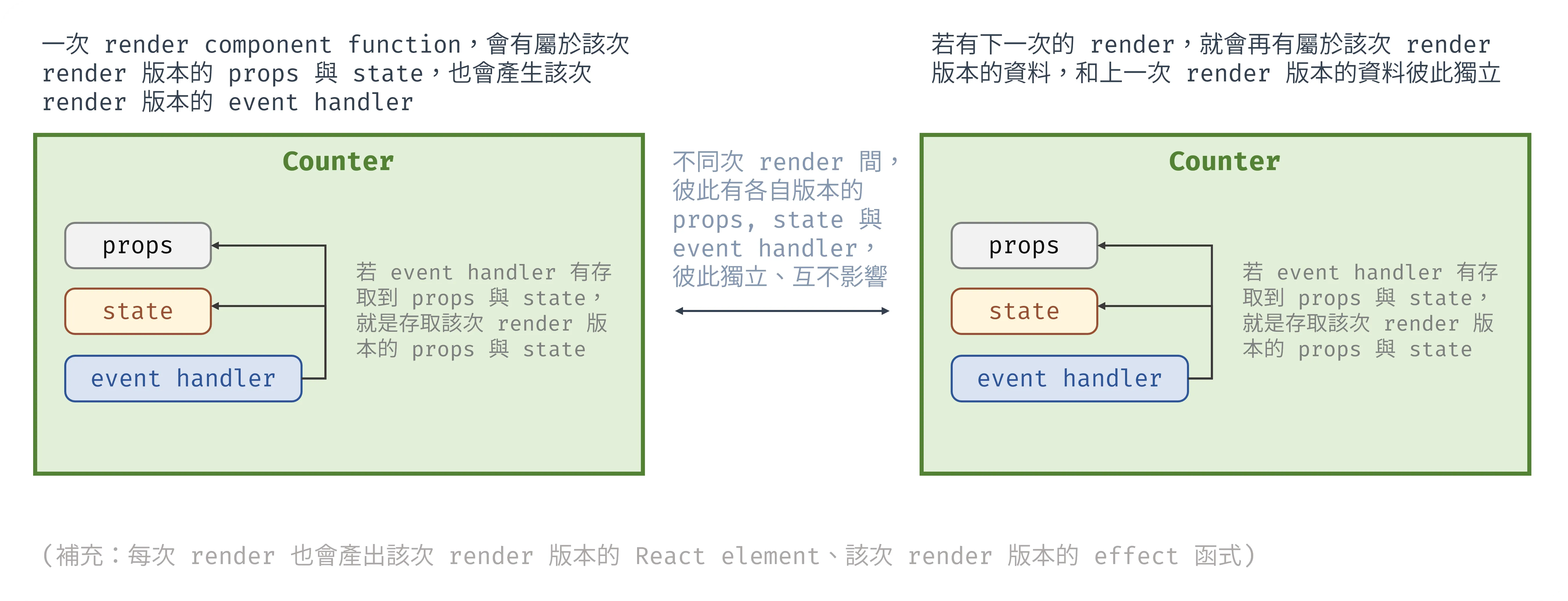每次 render 的 props 與 state 彼此獨立也不相同,而每次 render 時宣告的 event handler 都會透過 closure 綁定該次 render 版本的 props 與 state,延伸來看,可視為每次 render 都會產出全新的 event handler 函式。