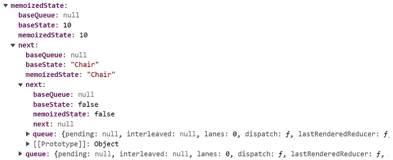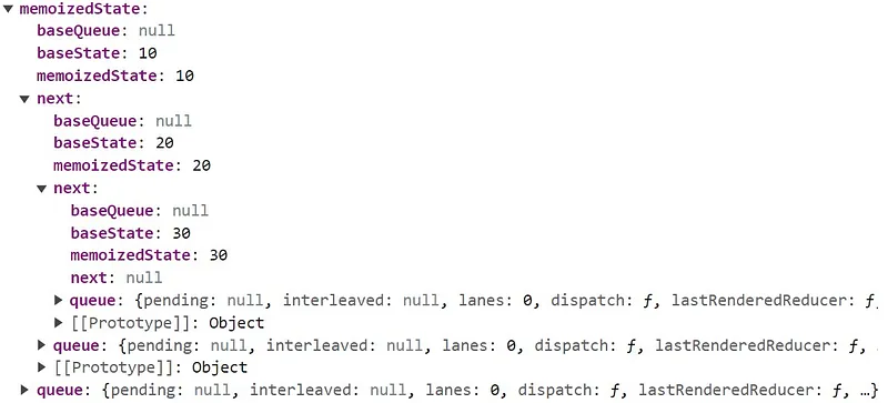 function default App() { const [count1, setCount1] = useState(10); const [count2, setCount2] = useState(20); const [count3, setCount3] = useState(30);}從 fiber node 可看出,第二個 state 會放在第一個 state 內,第三個 state 會放在第二個 state 內,如下圖。