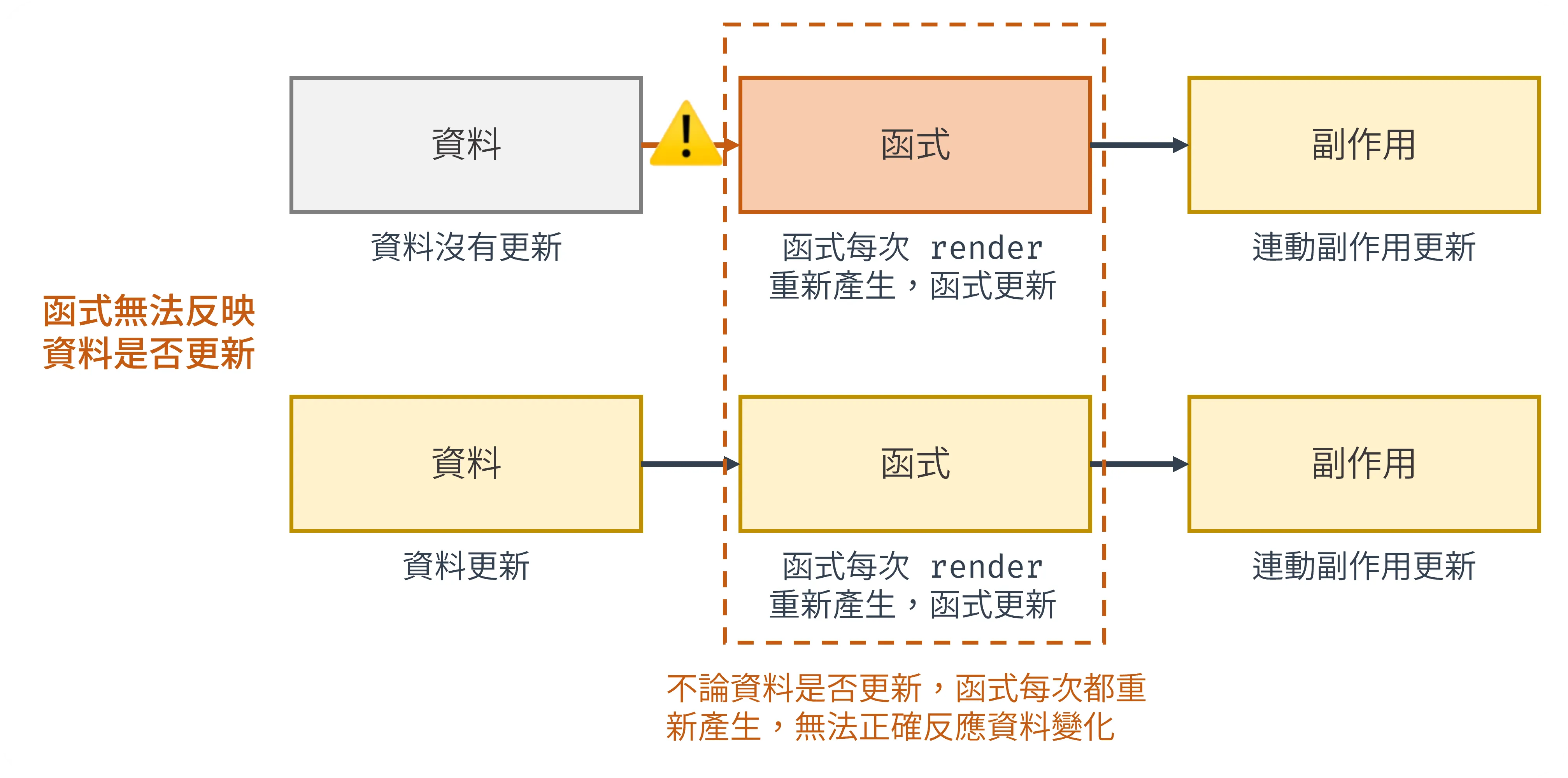 //...}因為 fetchData 每次 render 都會是新的函式,所以 dependencies 的效能優化會永遠失敗,其問題本質在於 component 資料流為「資料→函式→副作用」,但在「函式」節點無法反映資料是否真的有更新,連帶副作用無法判斷源頭是否有更新,示意圖如下: