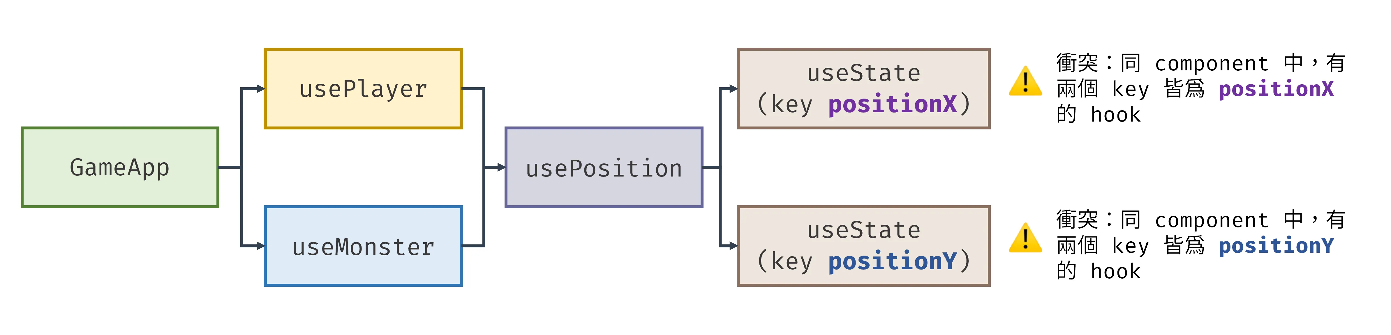 // ...}usePlayer 和 useMonster 都呼叫 usePosition ,導致 key 值為 positionX 與 positionY 的 hooks 被重複註冊,產生命名衝突。