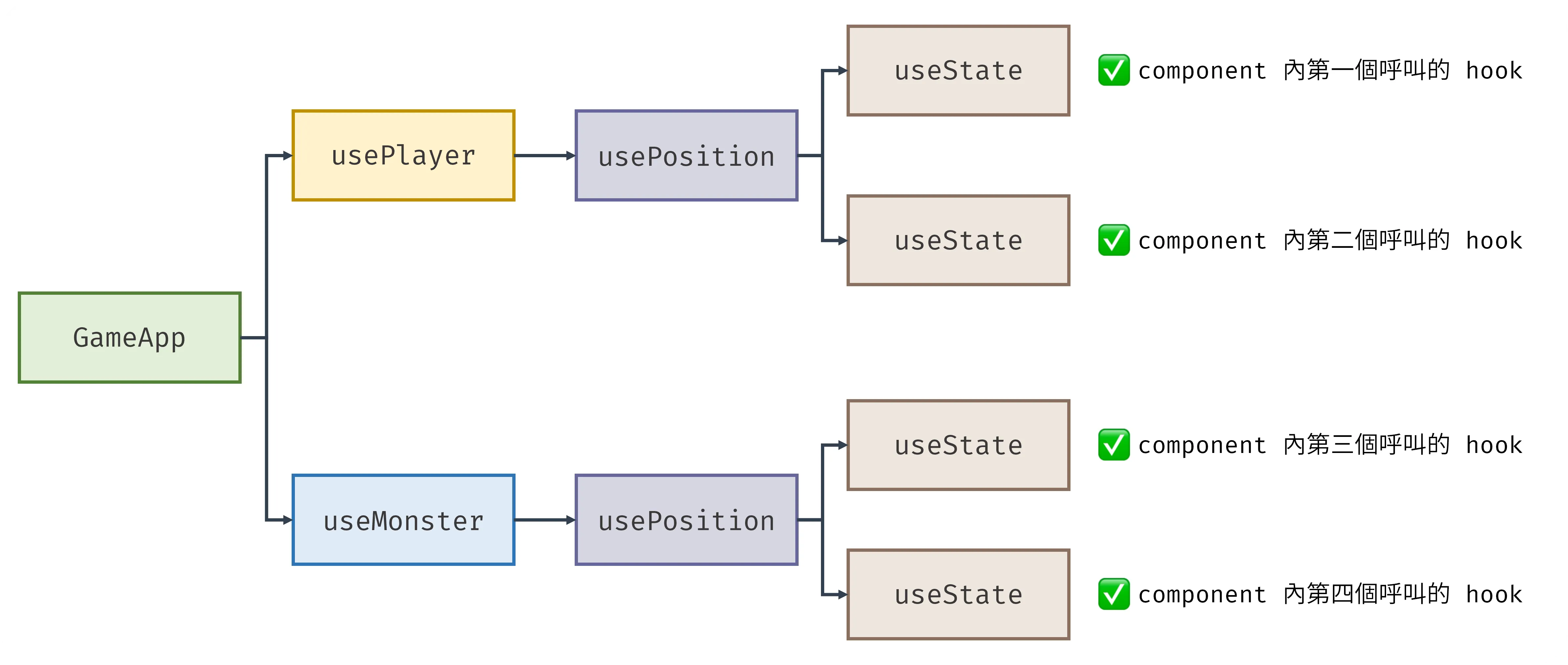 usePlayer 和 useMonster 都呼叫 usePosition,導致 key 值為 positionX 與 positionY 的 hooks 被重複註冊因此,React hooks 改為基於呼叫順序來區分 hooks,以所有 hooks 展開後的呼叫順序來區分並追蹤狀態資料。