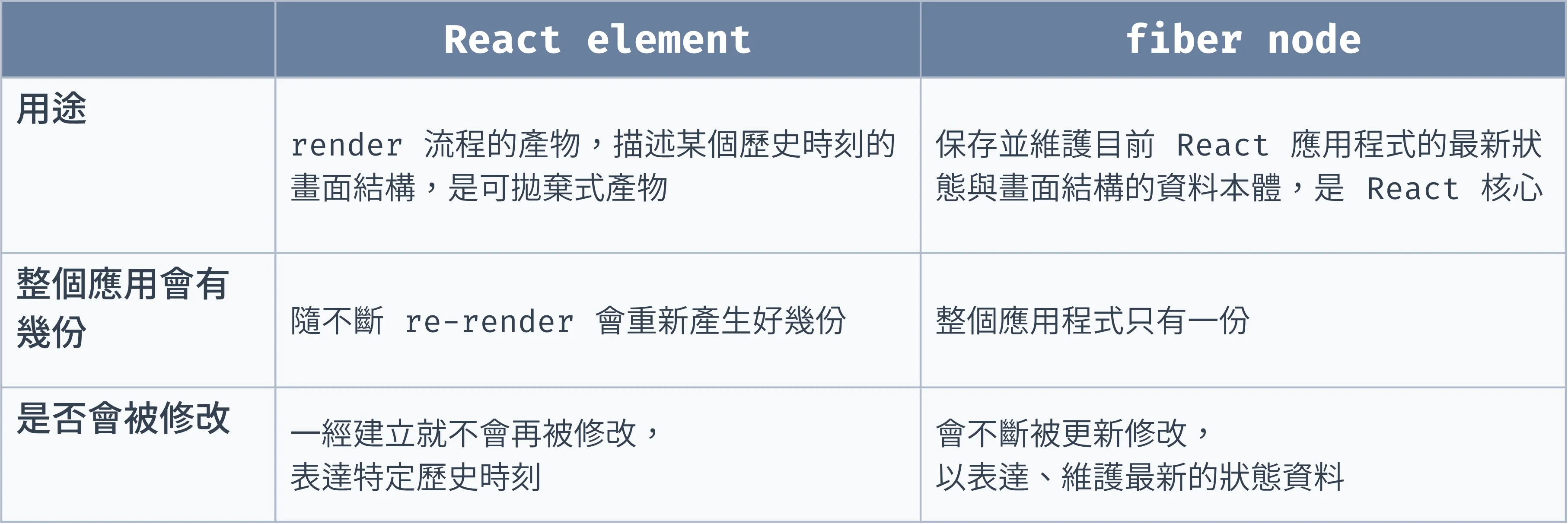 那 React element 與 fiber node 的關係與區別是什麼呢,簡單以以下表格說明: