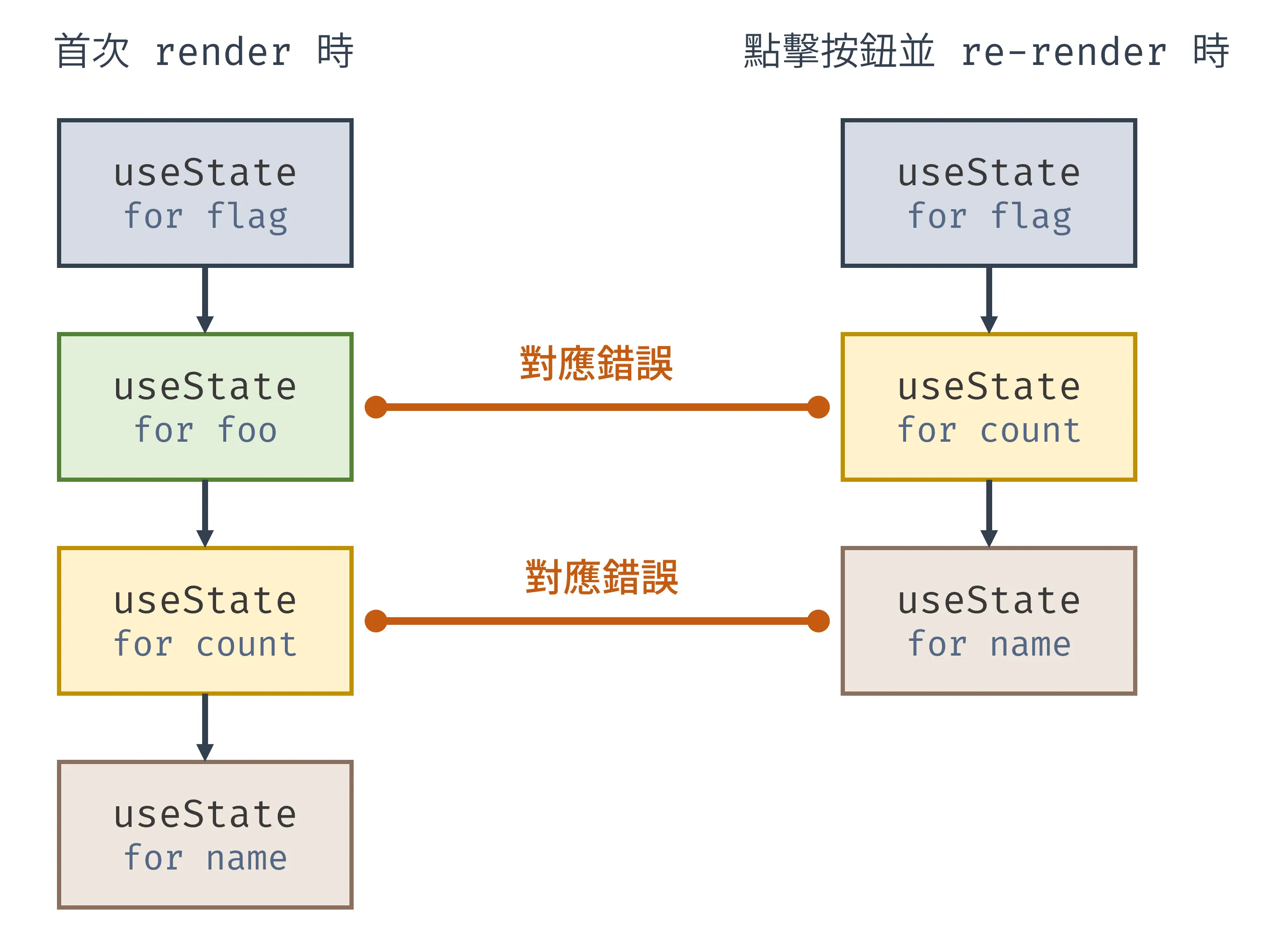 return ( <button onClick={handleClick}>click me</button> )}點擊按鈕 re-render 後,const [foo, setFoo] = useState("foo"); 會因為 flag 變成 true 而被跳過,造成後面的 count 和 name state hook 錯誤的對應前次 render 的 hook,資料錯置而產生錯誤,React 也會發現此次 render 呼叫的 hook 總數量與前次不同,因而報錯。