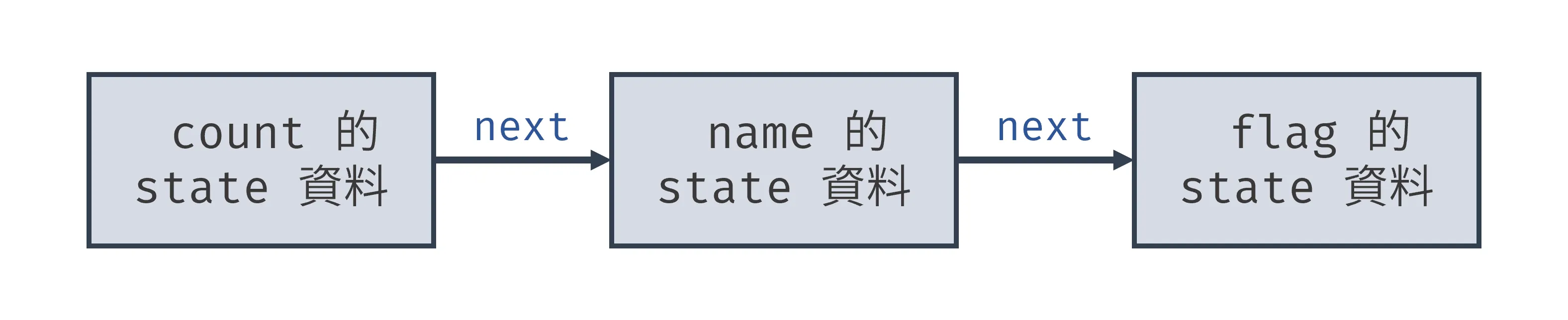 因為 React fiber node 會以 linked list 結構存放 state 資料,以此區別不同狀態資料,如下圖:
