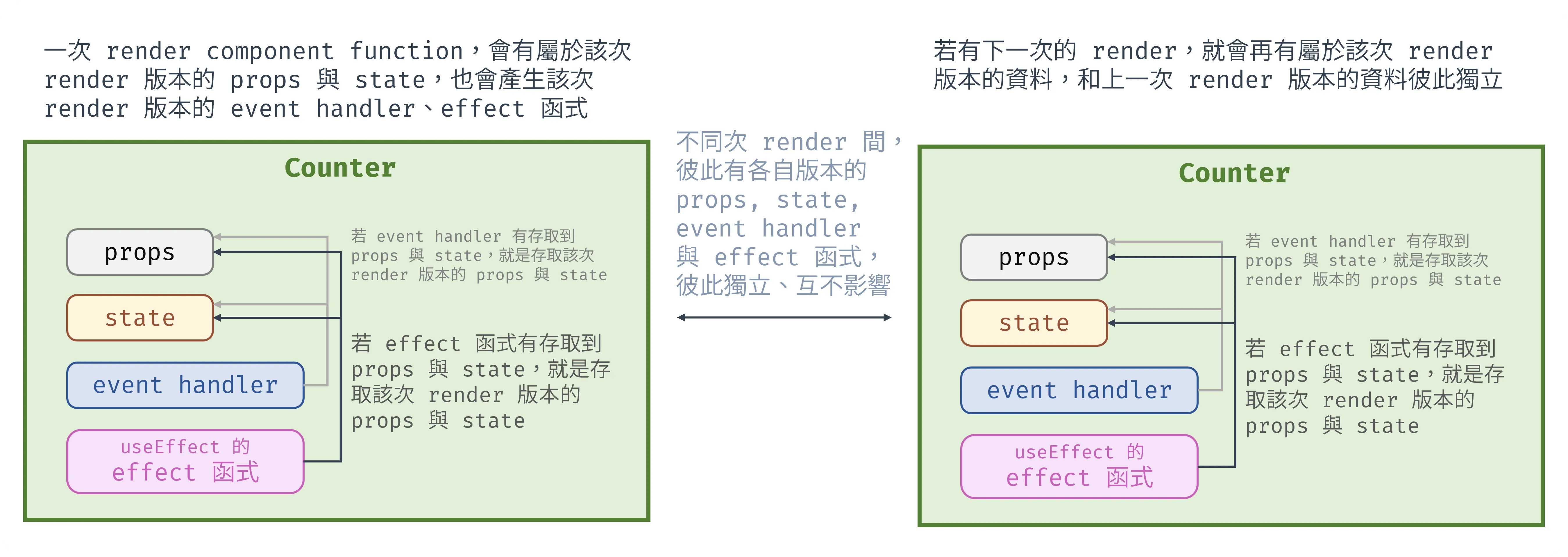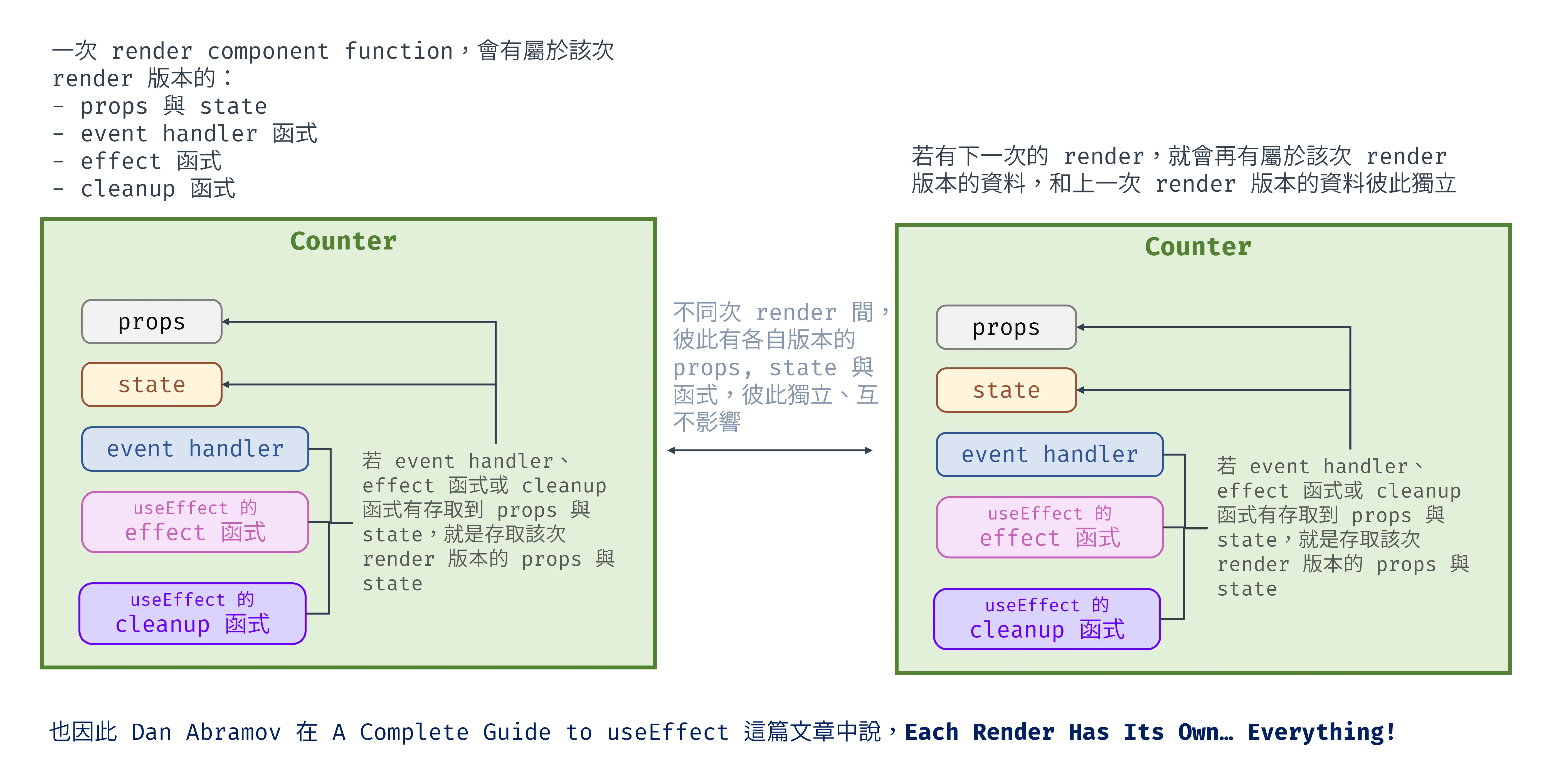 延伸上面 component 每次 render 的示意圖,可以總結 component 每次 render…