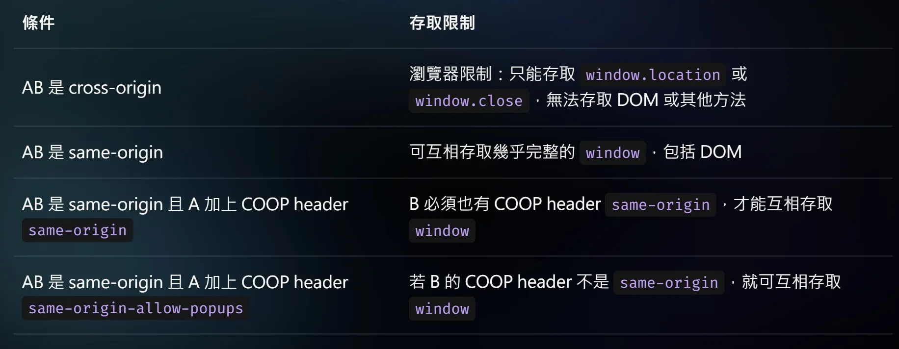 由上可知,互相存取 window 的條件必須是 same-origin,但是否能真的存取,取決於 COOP header。