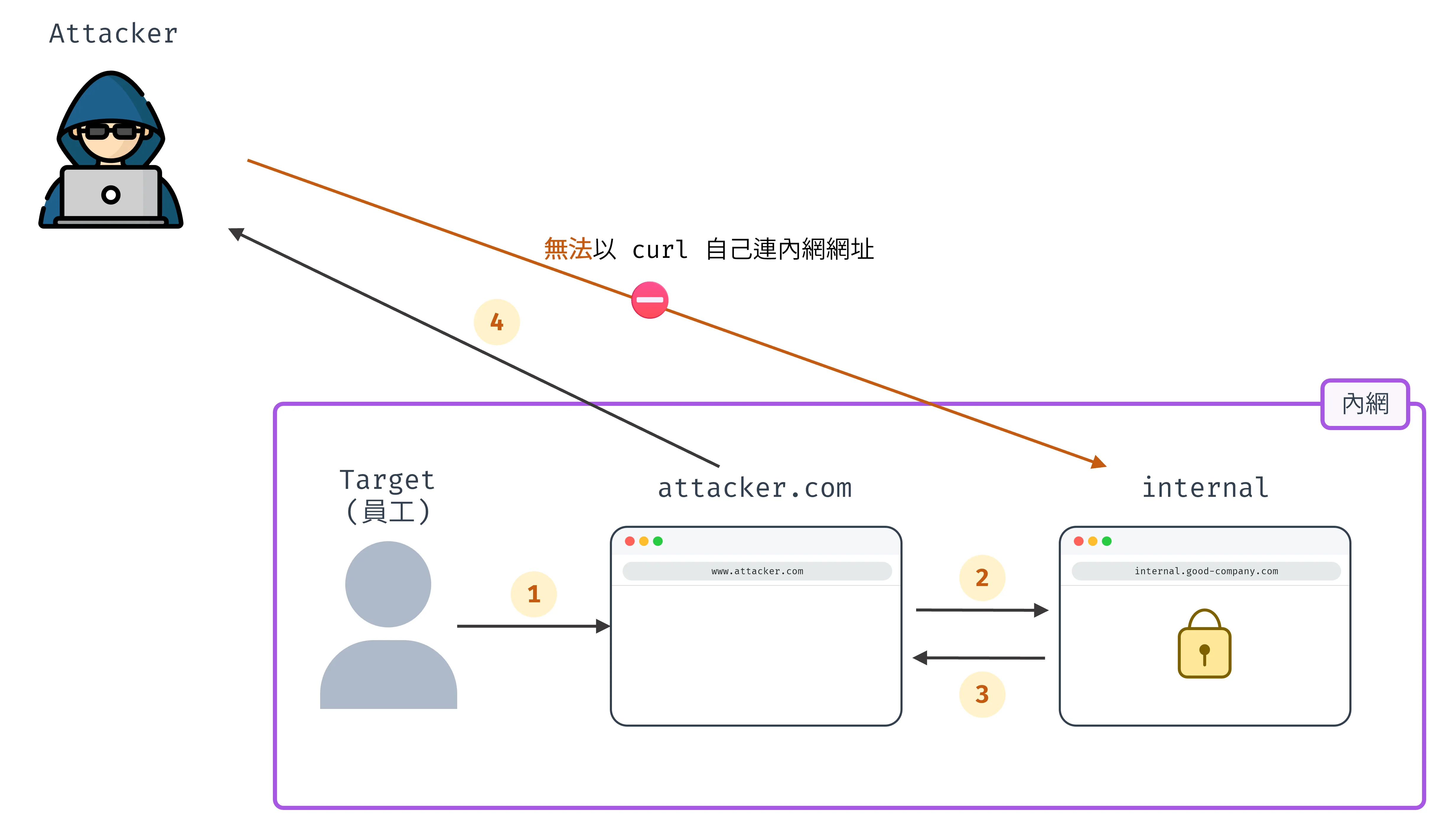 curl向公司內網http://internal.good-company.com請求,此時只會看到錯誤畫面,因為這不是在公司內網發請求,無權限,且可能連 domain 都無法連到,因為只有內網可以解析此 domain - 在瀏覽器發請求:自己寫個網站,讓內網使用者打開網站,寫好的網站再向內網發請求要資料