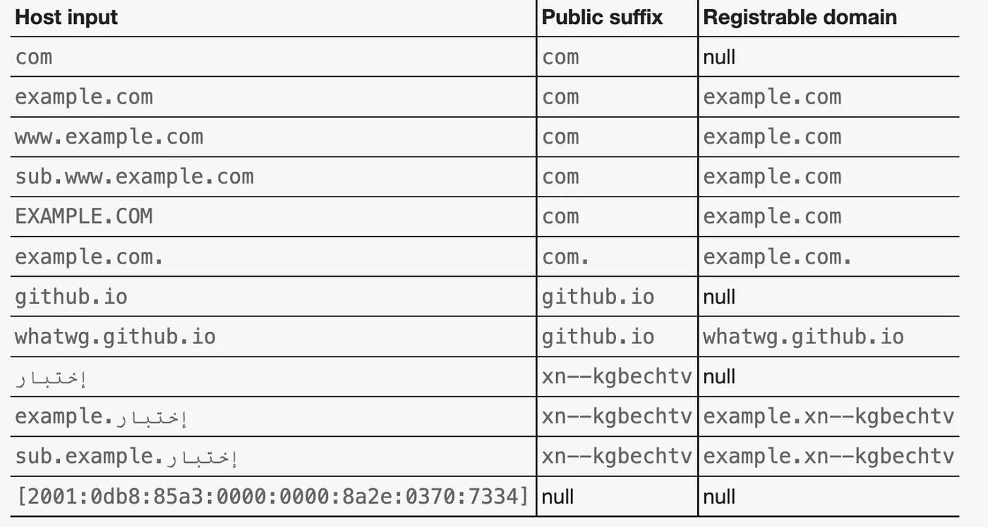 whatwg.github.io,匹配的 public suffix 是github.io - 加上 public suffix 左側的一段字串,形成 registrable domain。