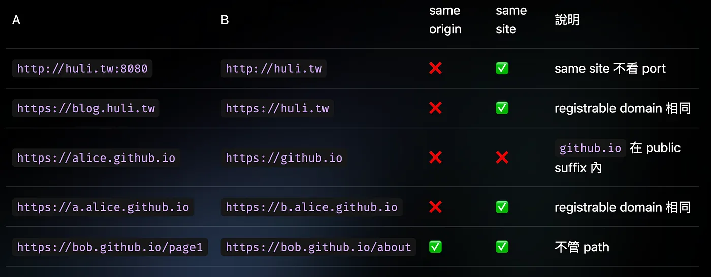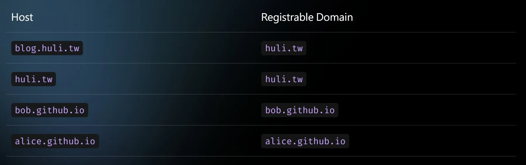 舉例來說,bob.github.io 和 alice.github.io 的 registrable domain 不同,不是 same site;而 blog.huli.tw、huli.tw 和test.huli.tw的 registrable domain 相同,是 same site。