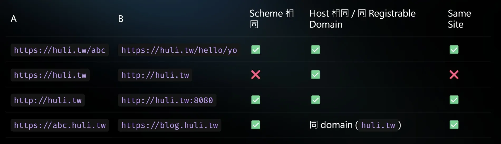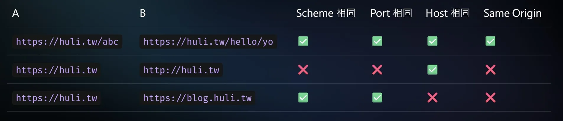 舉例來說,https://huli.tw/api 的 origin 是 https://huli.tw,因此 https://huli.tw/* 這類網址才會和它 same origin;又例如https://blog.huli.tw 的 origin 是 https://blog.huli.tw,和 https://huli.tw 不是 same origin,因為 host 不同。