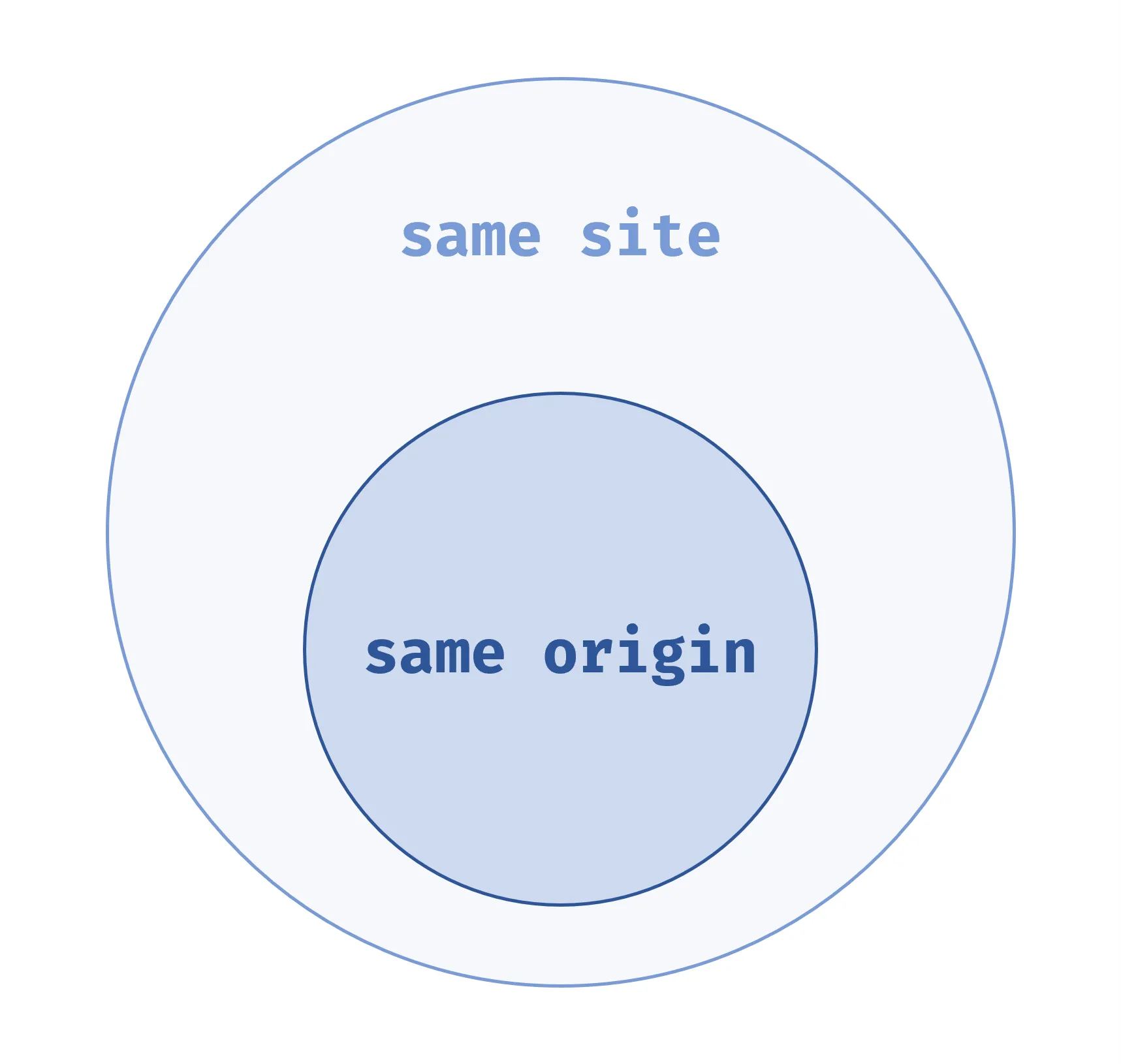 same origin 會看 scheme、port 和 host,而 same site 會看 scheme 和 host(registrable domain)。由此可看出 same origin 比較嚴格,所以兩網站是 same origin,則一定是 same site,兩者關係示意圖如下。