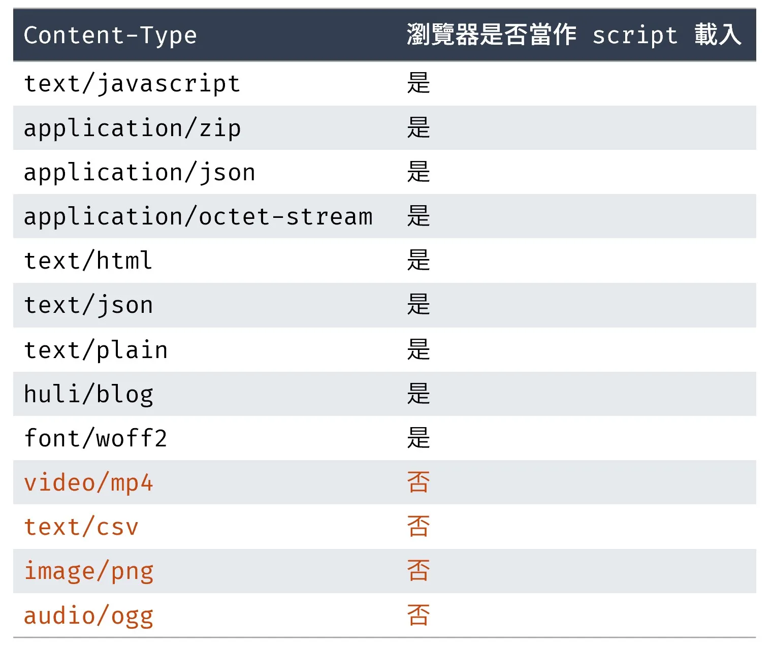 如果覺得允許作為 script 載入的 content type 類型太廣泛,想要只讓 JavaScript MIME types 載入,其他都不允許,可在 response 新增 header:X-Content-Type-Options: nosniff,加 X-Content-Type-Options: nosniff 後,用 script 載入上述表格列的 content type 都不行,會跳錯。而 style 也是,加上X-Content-Type-Options: nosniff 後,用 style 載入時,只有 text/css 會被認可,其他會跳錯。