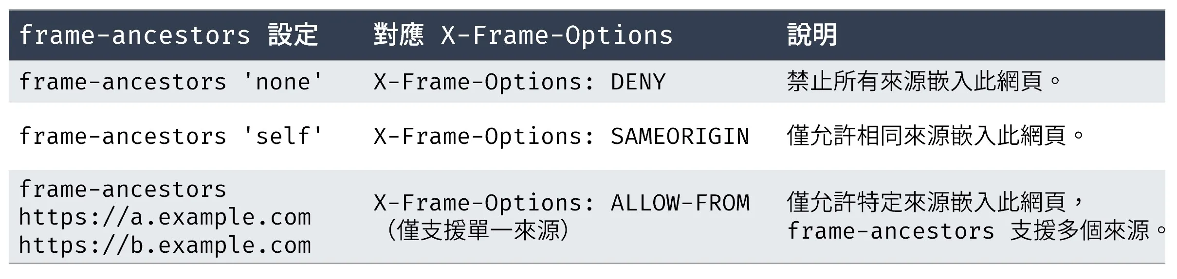 CSP 指示 frame-ancestors 可達到 X-Frame-Options 的限制效果,限制「哪些網頁可以把我用 iframe 嵌入」,frame-ancestors 設定方式對應 X-Frame-Options如下表格。