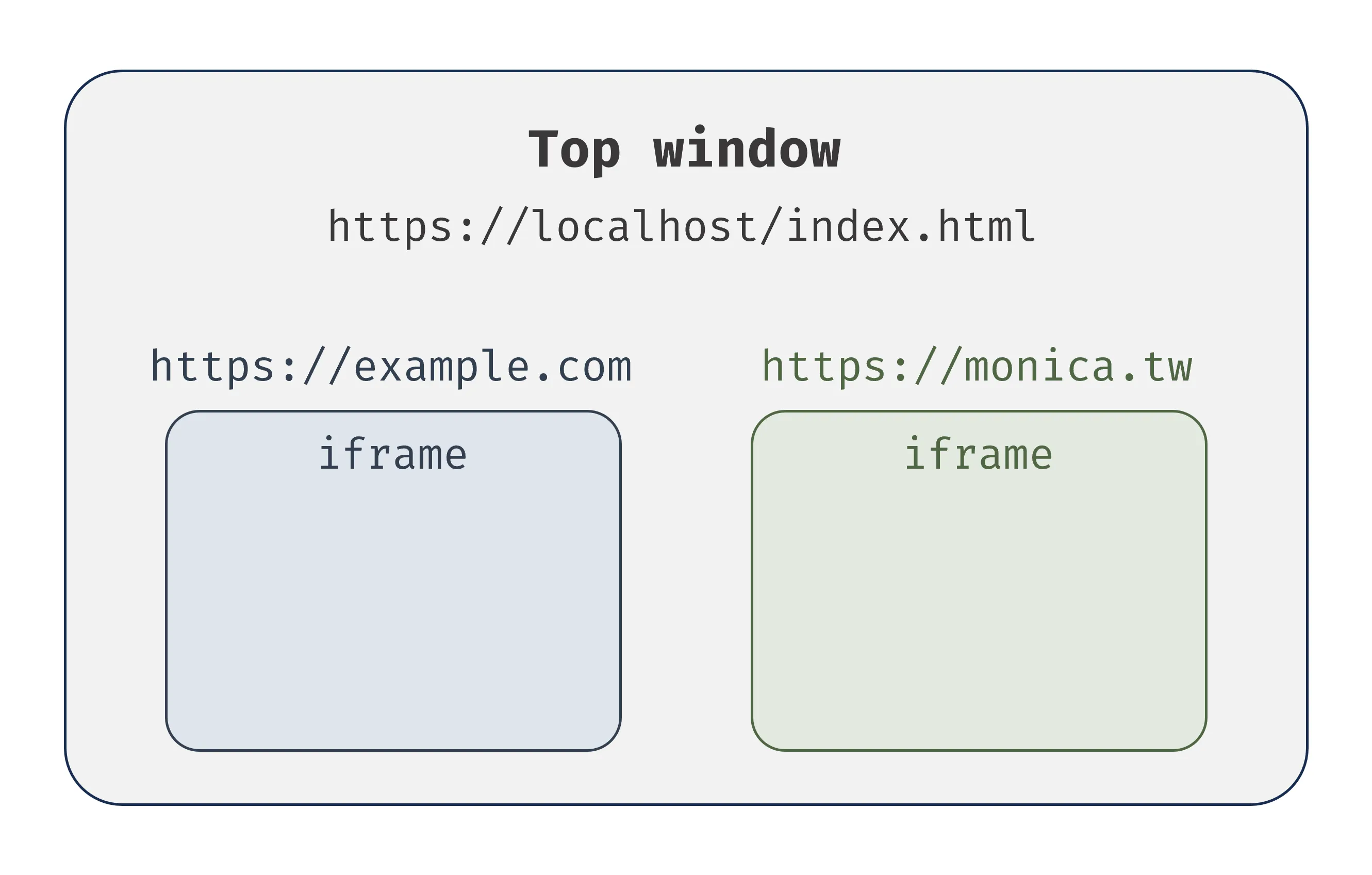舉例來說,localhost 內有 index.html,裡面嵌入兩個 iframe: