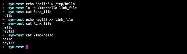 (2) 在當前目錄下建立一個 symbolic link,指向剛建立好的 hello 檔案:ln -s /tmp/hello link_file
