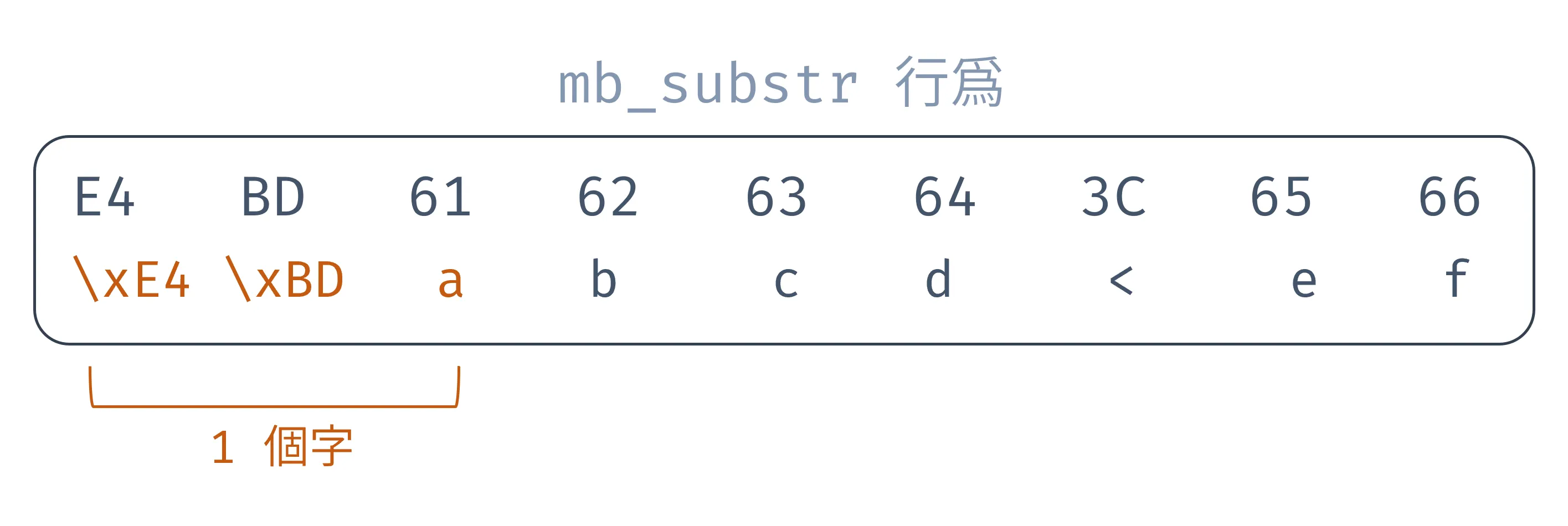 而這兩者解析不一致會導致取得子字串時,結果與預期不同,以下面範例來說,對 mb_strpos,< 是第 6 個字;但對 mb_substr,e 是第 6 個字。因此取前 6 個字時,會得到 \xE4\xBDabcd<,多拿到 <,而非預期的 \xE4\xBDabcd。