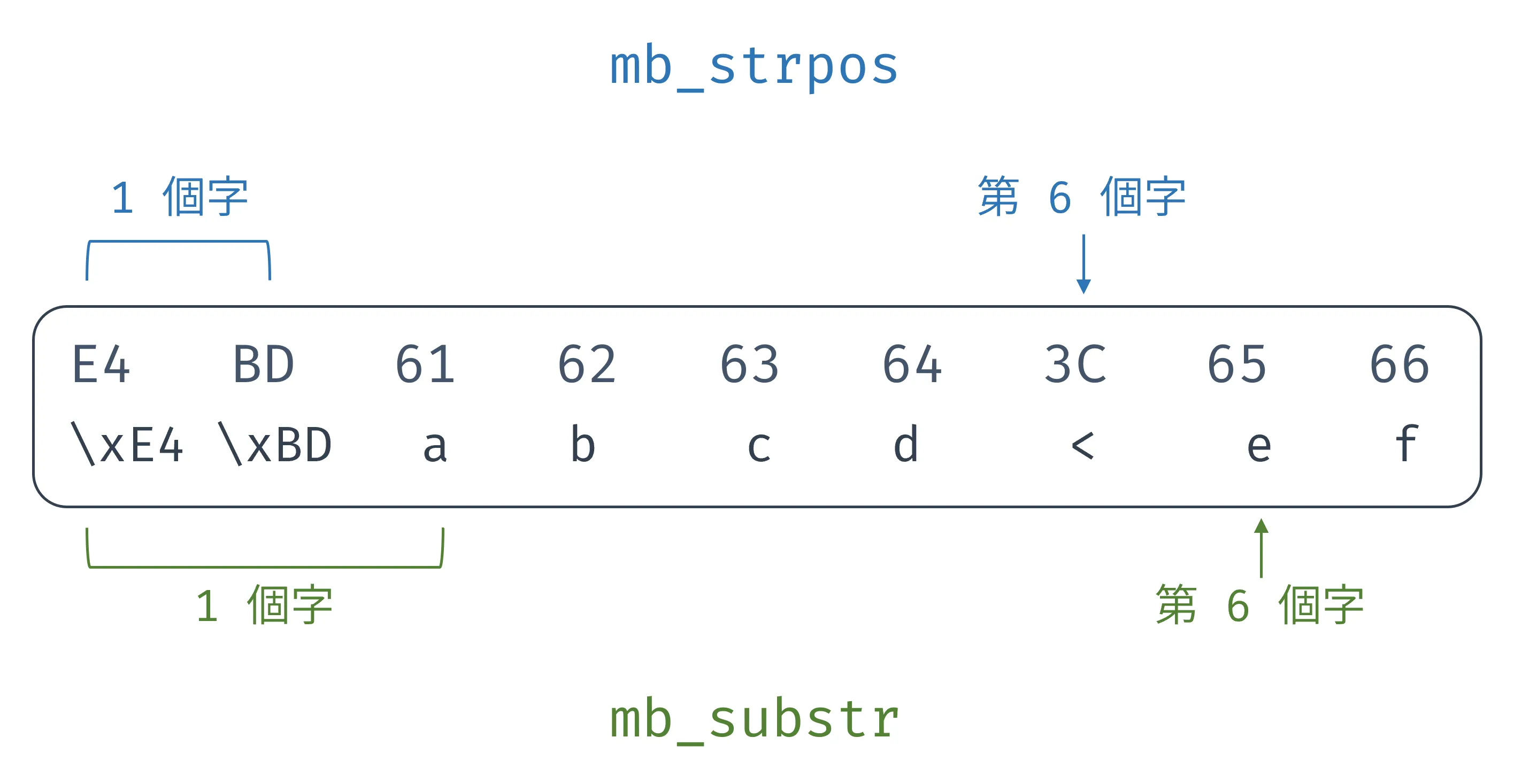 <?php $input = "你好"; echo mb_substr($input, 0, 1); echo substr($input, 0, 1);?>不過如果尋找字串和取字串的函式統一用或不用 byte,就沒問題,以下程式碼中,mb_strpos 找到 index 為 1 的 好,mb_substr 根據 index 取對應值;而 strpos 找到 index 為 3 的 好,substr 根據 index 取對應值,都沒問題👌。