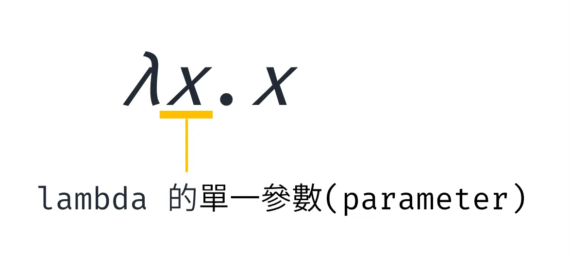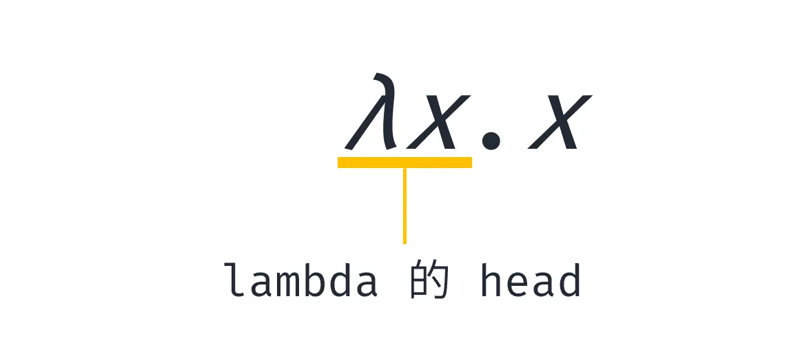 中間的點. 用來分隔參數與 body,. 後面的 是 function 的 body,這是 function 在應用時會回傳的表達式。這裡的 是被 head 中的參數綁定的 bound variable。